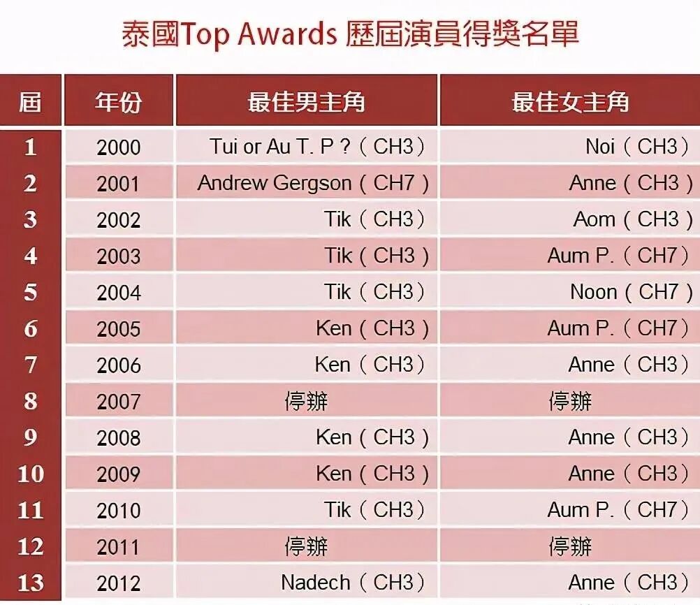 到了2010年憑藉《虎紋月亮》第三次贏得Top Awards最佳女主角時,基本已經穩穩坐上他泰一線大花的位置。