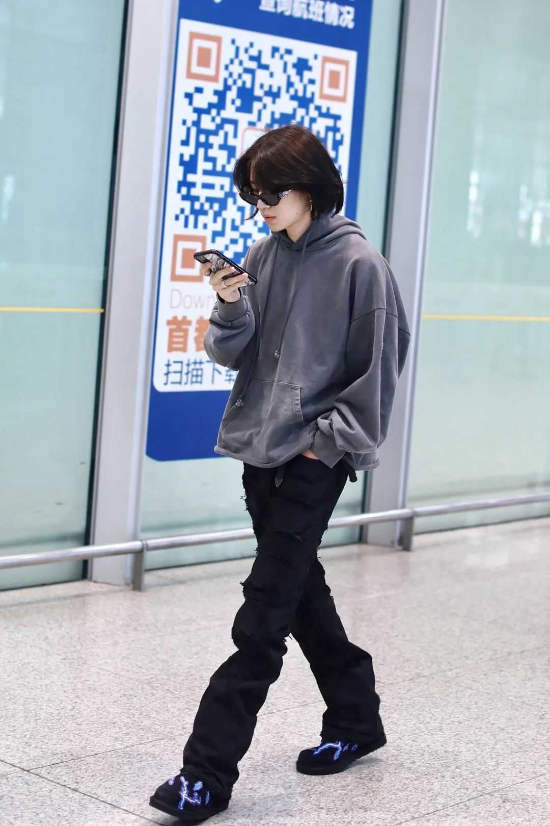 好日系的髮型,小鬼這個小臉也太精緻了吧。灰色的連帽衛衣加黑色長褲,身上唯一的“色彩”是紅髮和鞋上藍色的閃電,冷酷的街頭少年既視感。