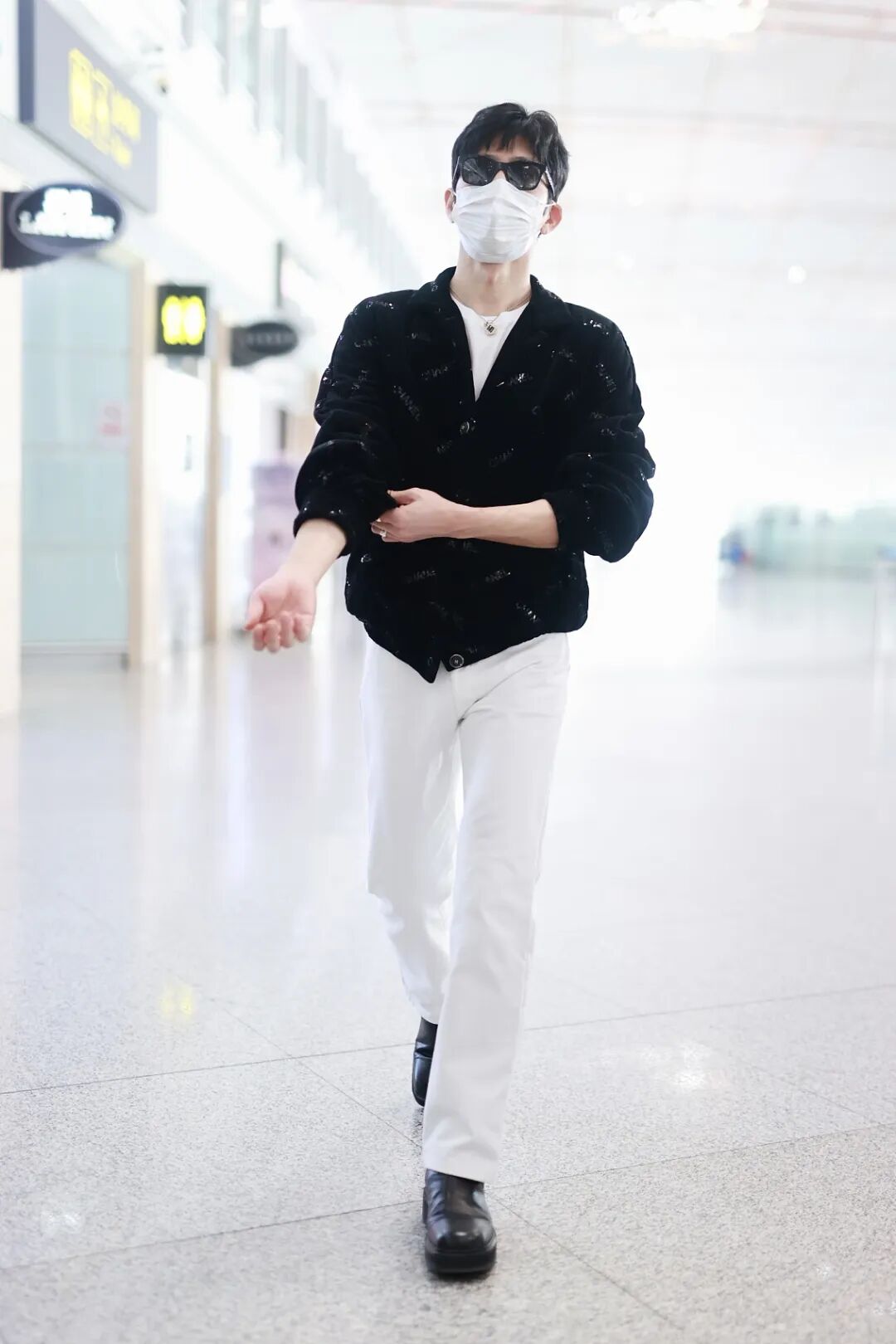 這是出發去巴黎時裝週和表姐一起秀恩愛之前的井寶,極簡的黑白Look也是貴氣十足,外套上的反光logo好吸睛,配飾選了條黑白項鍊,好會搭。