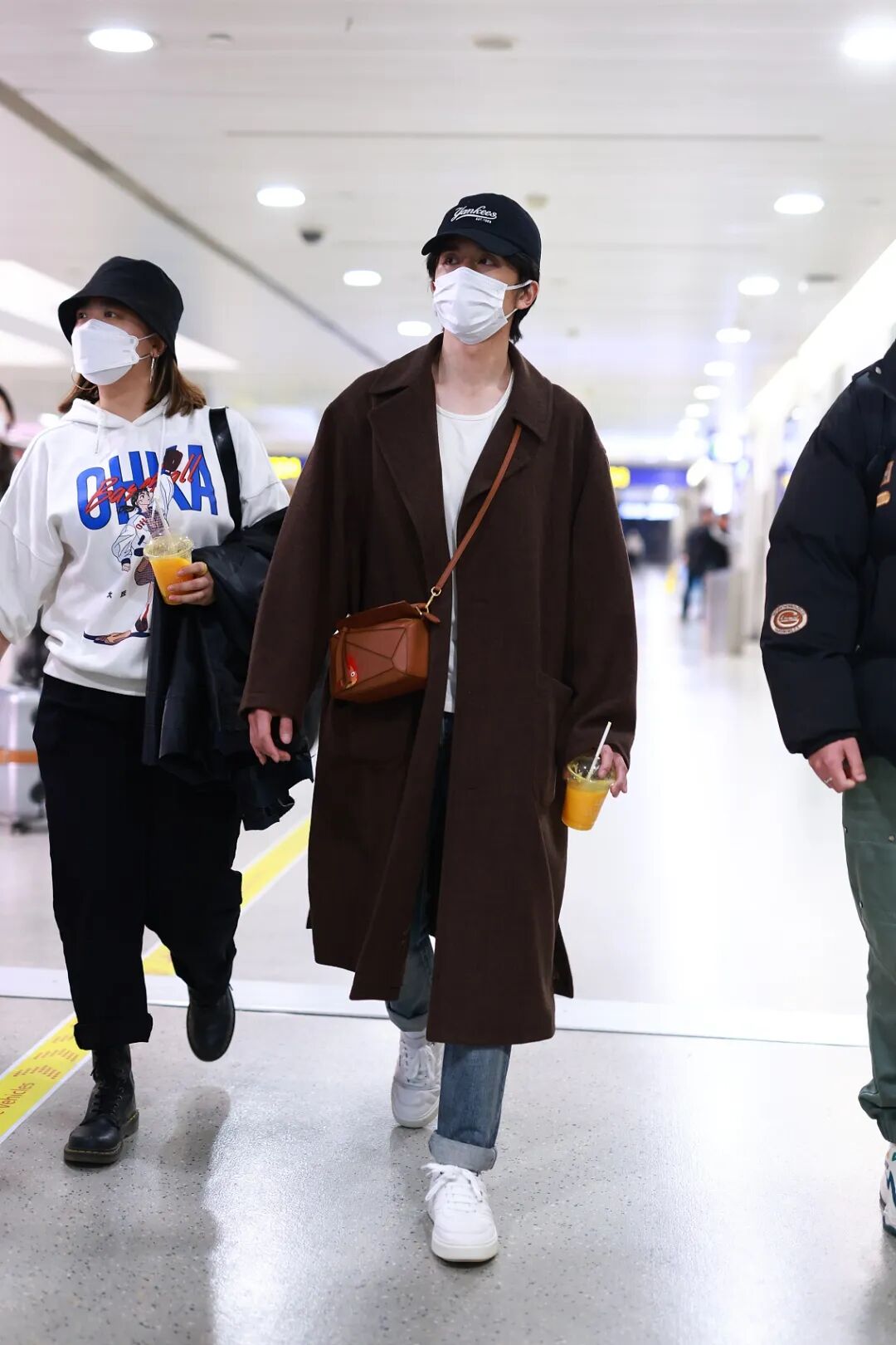 今天唯一的大衣選手。拼接設計的包包和大衣做了棕色的呼應,內搭基礎款的白T、牛仔褲和小白鞋,休閒又時髦的鄰家本哥哈。