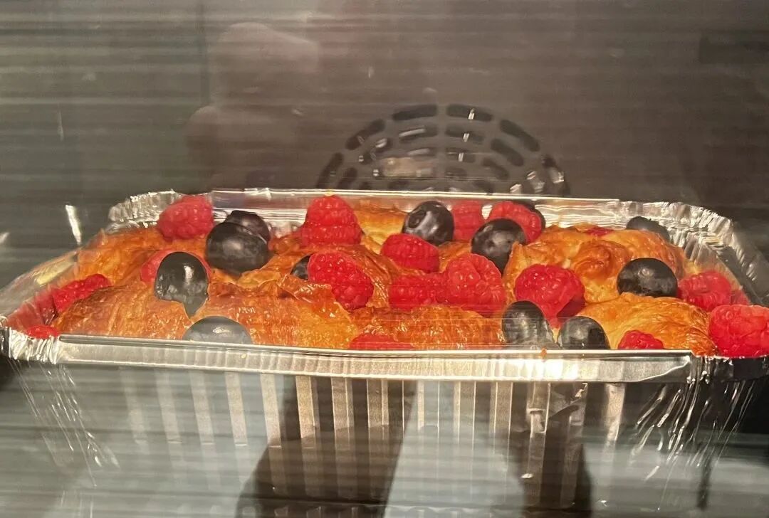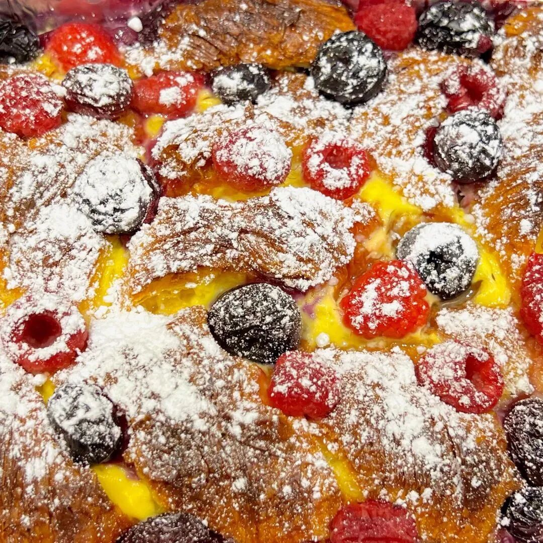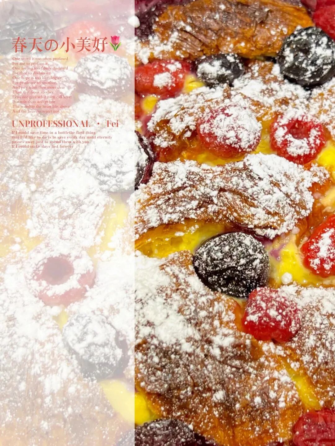 這個小甜品融合了法式吐司的香甜,可頌的酥脆和蛋撻的蛋奶香氣,藍莓和樹莓的酸甜可以中和蛋奶液的甜膩,多放一點糖,簡直就是幸福感爆棚~