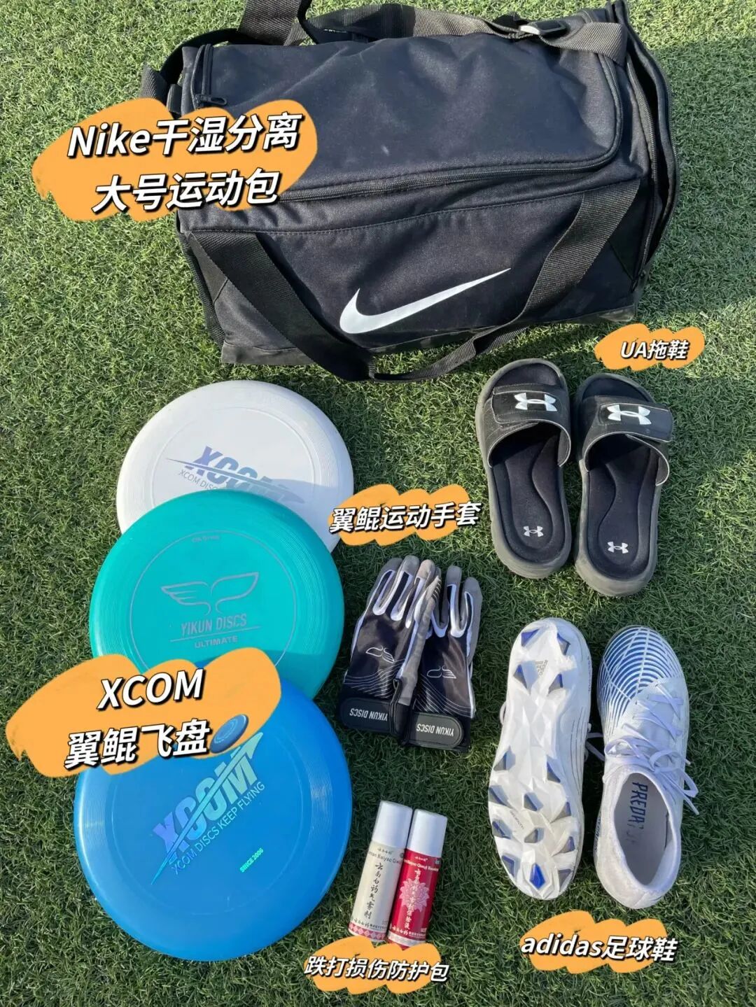 1)Nike的大號運動包,經常揹著它奔跑在各個飛盤局。特意買了大號,容量超大自重輕,乾溼分離,有獨立鞋倉,防水耐用。游泳、健身、飛盤都🉑️