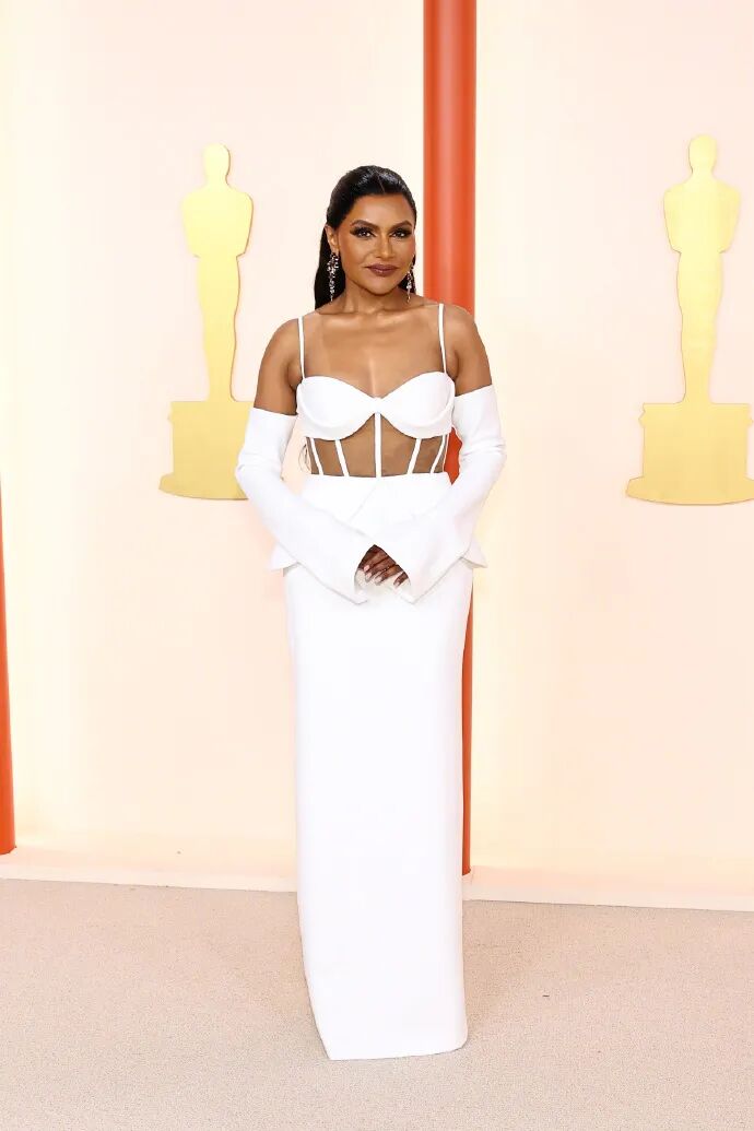 敏迪·卡靈白色鏤空裙亮相,性感又滿含神秘韻味。