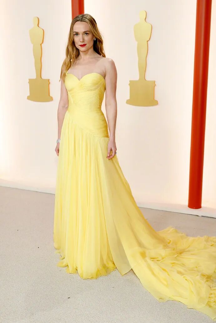 凱瑞·康頓淡雅抹胸黃裙亮相,典雅而含蓄。