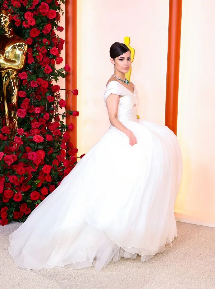 索菲亞·卡爾森一襲白色紗裙搭配綠寶石項鍊,清新明豔,優雅精緻。