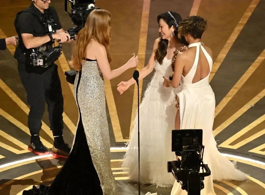 奧斯卡上,還有三位影后驚喜同框,奧斯卡第一個“有色人種”影后哈利·貝瑞為楊紫瓊頒獎 ,上屆奧斯卡影后“勞模姐”傑西卡·查斯坦也擔任頒獎嘉賓。