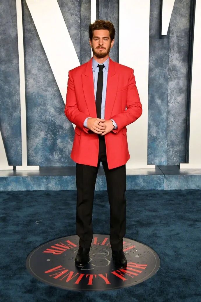 安德魯·加菲爾德紅色西服搭配經典黑西褲,時尚帥氣又有型,