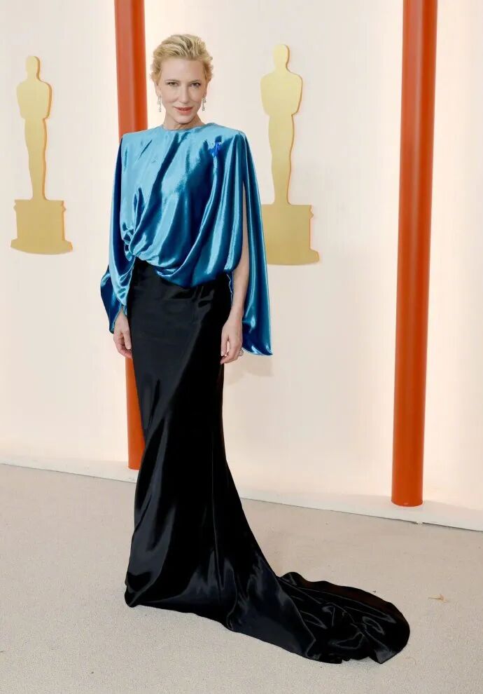 大魔王凱特·布蘭切特紅毯上身著藍色絲絨墊肩禮服華麗亮相,端莊大氣,奢華而富有格調。
