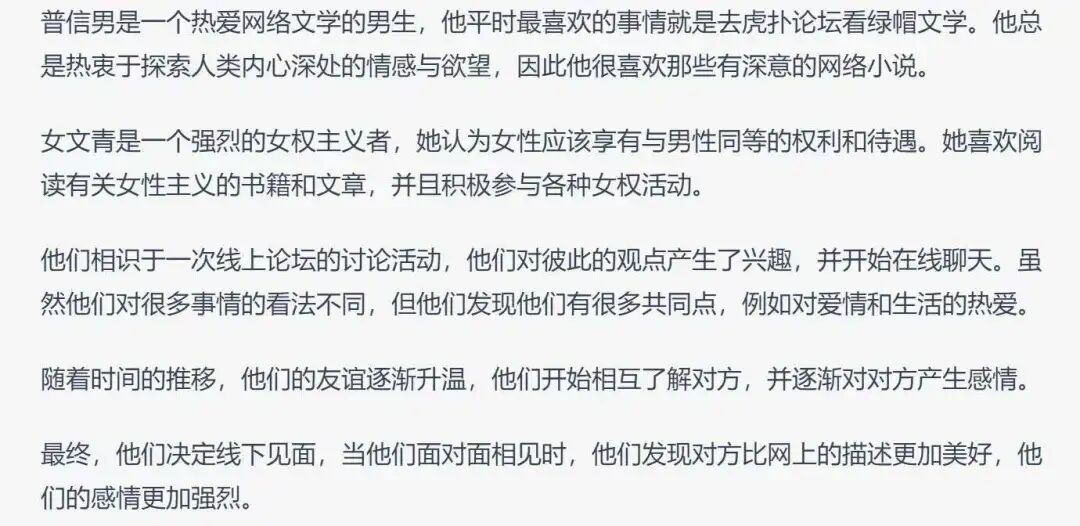 甚至,如果你的提問不夠詳細,那麼ChatGPT所生產出來的內容,很可能會極度抽象,就像下面這篇宛如“新怪談”一般的愛情小說: