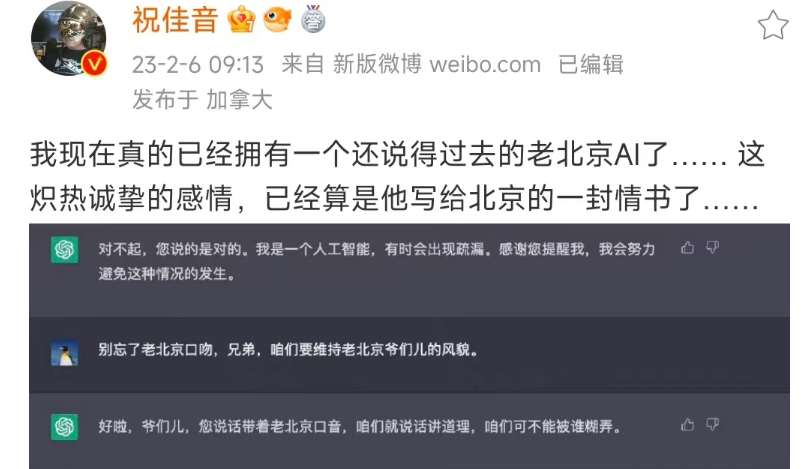 在國內微博大V祝佳音老師的悉心調教下,AI甚至學會了如何當一個地道的老北京。