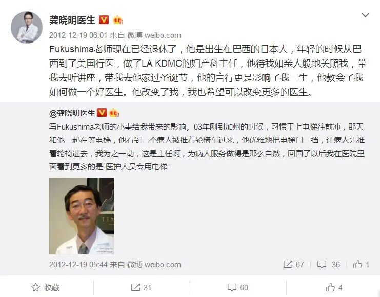 其實早在2003年前往美國進修時,老師Fukushima對病患視同親人,可以親自攙扶產後的病人下床,導師的一言一行就讓他感受到為何在美國稱“醫療是服務行業”。服務意識開始滲透到龔曉明教授的思考當中,Fukushima改變了龔曉明教授,龔曉明教授希望可以改變更多的醫生。