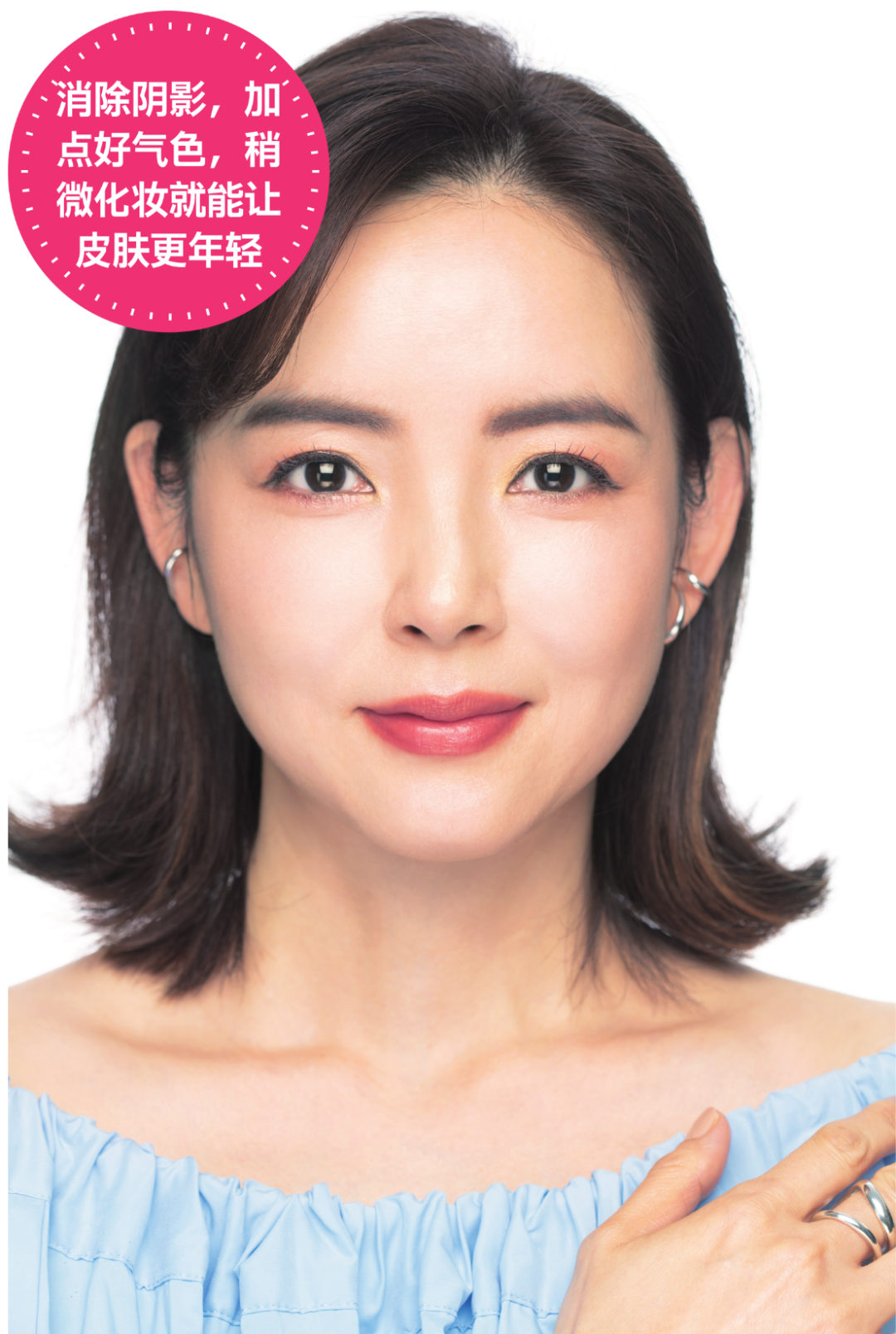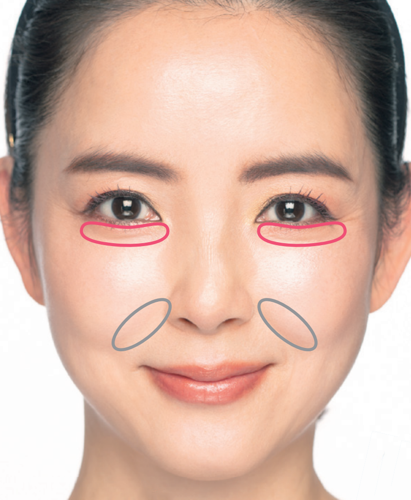 顴骨下方的凹陷和嘴角的陰影讓人看起來很老。塗上遮瑕膏後就可以瞬間點亮面部,臉看上去更優雅。