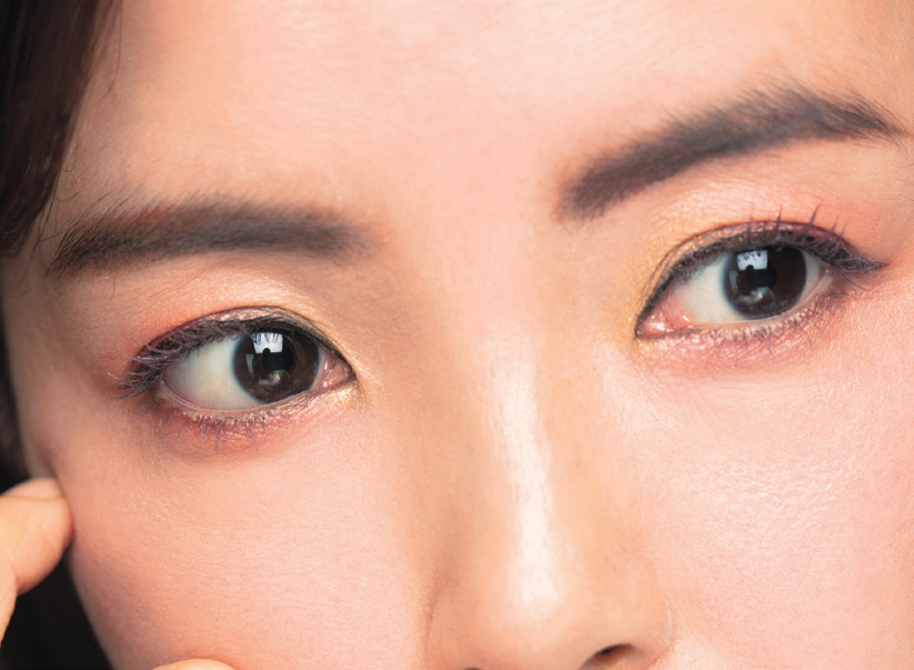 針對眼袋的鬆弛部分,不要勉強去遮蓋鬆弛的陰影,而要打上溫暖的珍珠色眼影,使其看起來像臥蠶一樣飽滿。