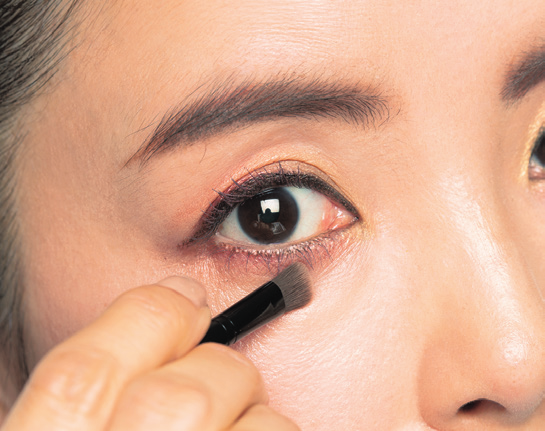 在下眼臉塗上粉色和橙色等暖色調,打造珠光色。混合深粉色和淺粉色兩個顏色,沿著下眼臉大範圍塗抹,並用指腹輕輕按壓貼合皮膚。