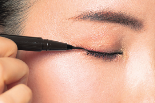 眼線要選擇易上手且有提拉緊緻效果的棕色。沿著眼角描畫,可以稍微往後延伸一點。手不要抖,慢慢沿著眼角勾勒延伸。