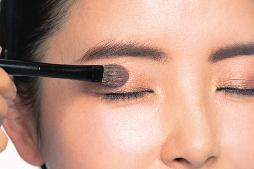 先在整個上眼瞼塗一層底色,除去眼臉的暗沉使其看起來平坦光滑。之後在眼窩處疊加上米駝色。