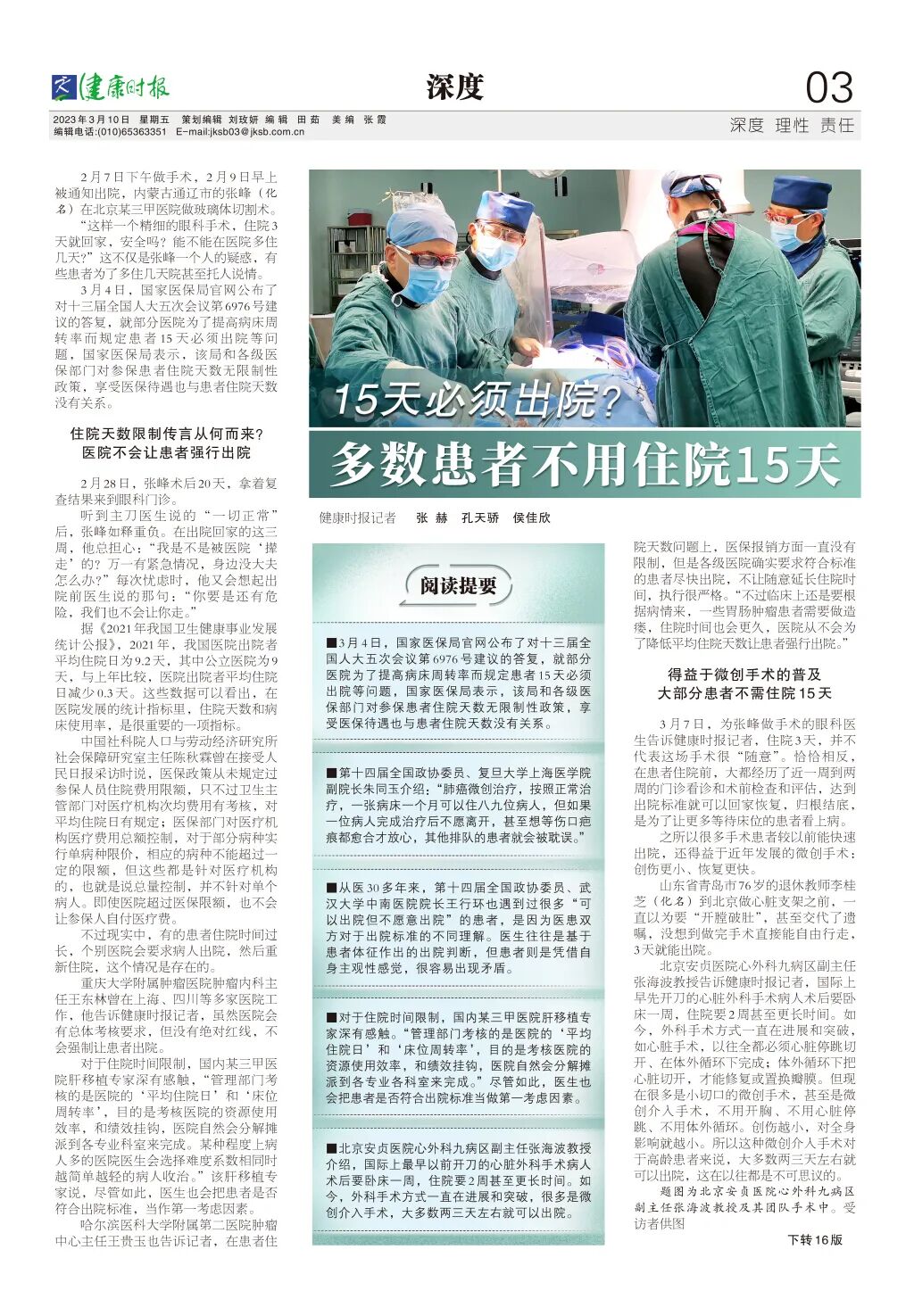 本文來自:2023-03-10健康時報《15天必須出院?多數患者不用住院15天》(健康時報記者 張赫 孔天驕 侯佳欣)