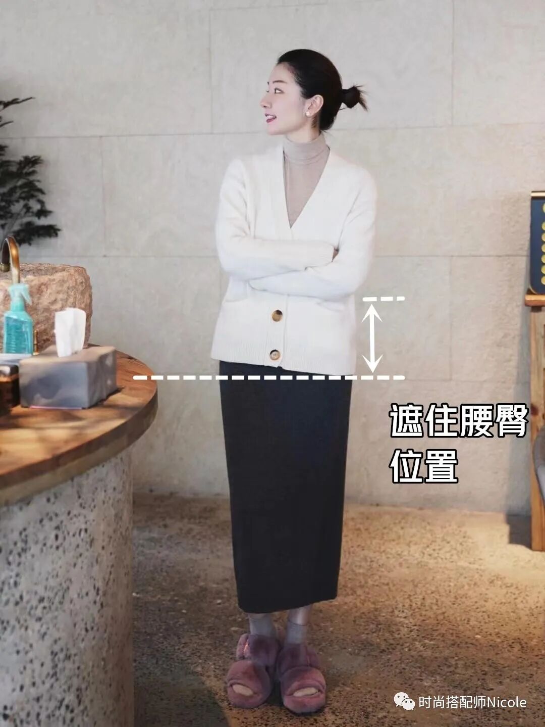 其次就是選對上衣,腰臀胯有肉的姐妹,要選擇臀下的上衣+深色的裙子,上有外衣遮肉,下有深色顯瘦,即使要敞懷穿,深色也不嫌肚子。