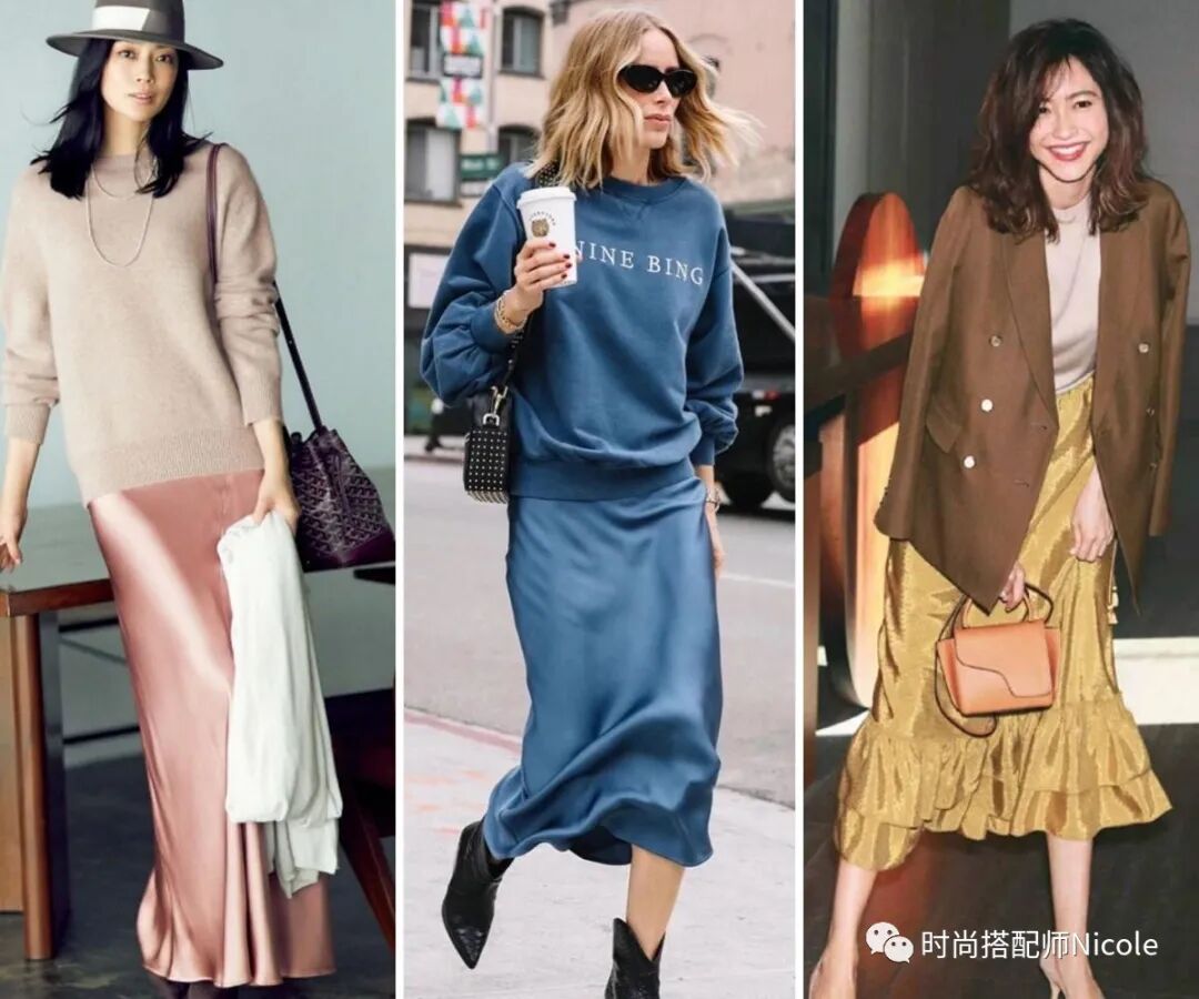 而且緞面裙特別適合混搭,和西裝混合能中和西裝的硬朗感,和毛衣混搭能增加女性的柔美,和衛衣混搭能中和衛衣的休閒感。