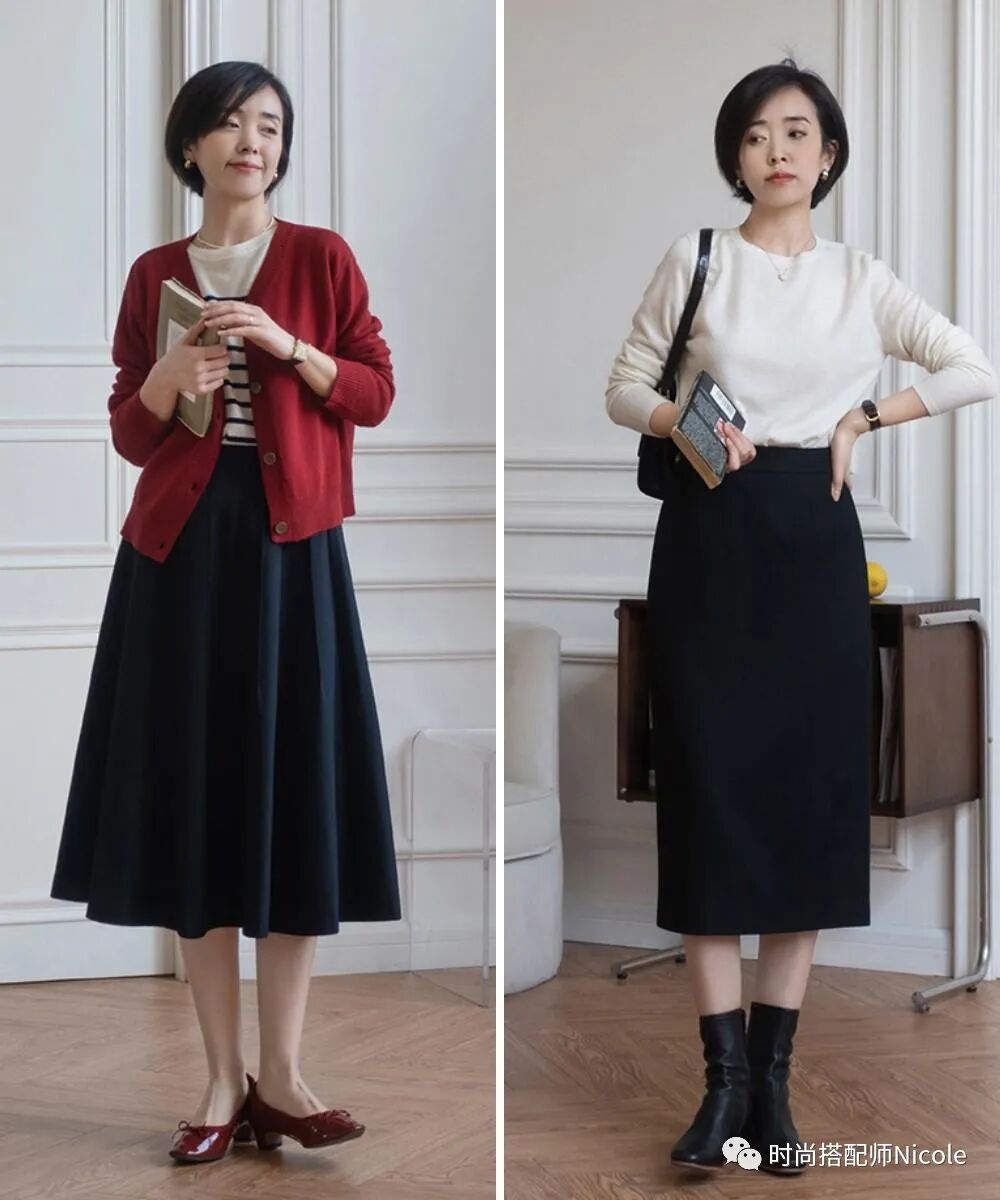 最常見的傘裙、直筒裙可以根據身材去選擇,腿不直、大腿有肉的適合直筒裙,而腰腹臀有肉的則適合傘裙,傘裙比直筒裙更優雅、更有氣場感,但是直筒則更加幹練、溫柔。