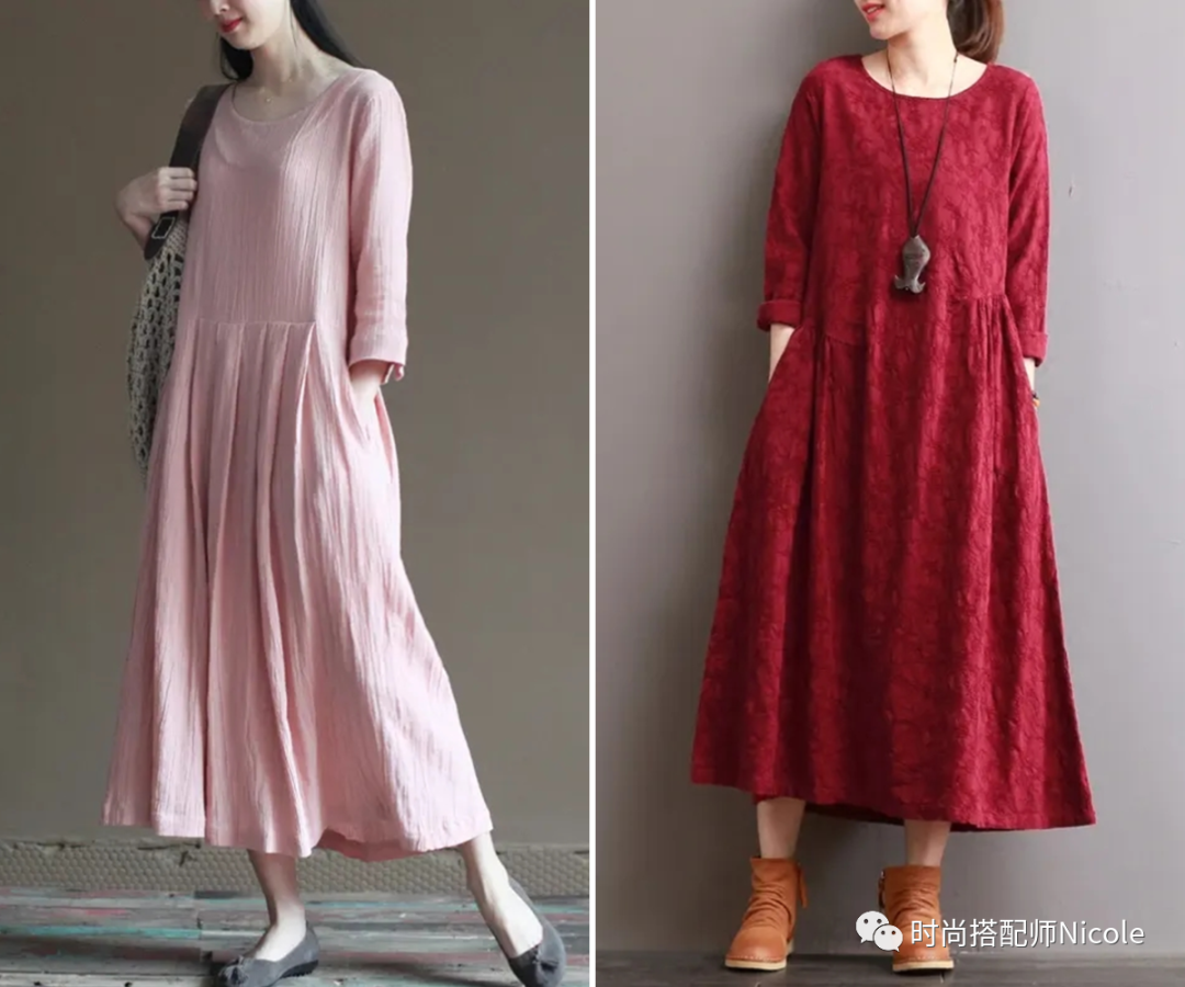 中年女性很多身材都有些許走樣,但是別為了遮擋一味地選擇寬鬆款,特別是這樣的棉麻裙,原本就很圓滑的剪裁版型會讓圓潤的身材更加明顯,原本你只有120斤,但是穿了這個衣服,一下顯得有150斤。