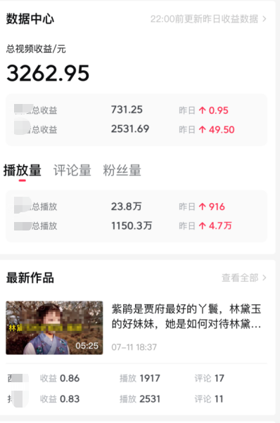 目前他的短視頻賬號已經累計8千粉絲,他的作品通過參加短視頻平臺的【中視頻計劃】已經變現3200多元,每天現在都能有幾十到幾百不等的收入。在老師的建議下,他還在逐步開拓帶貨渠道。