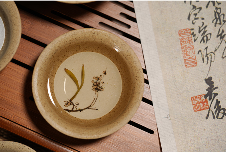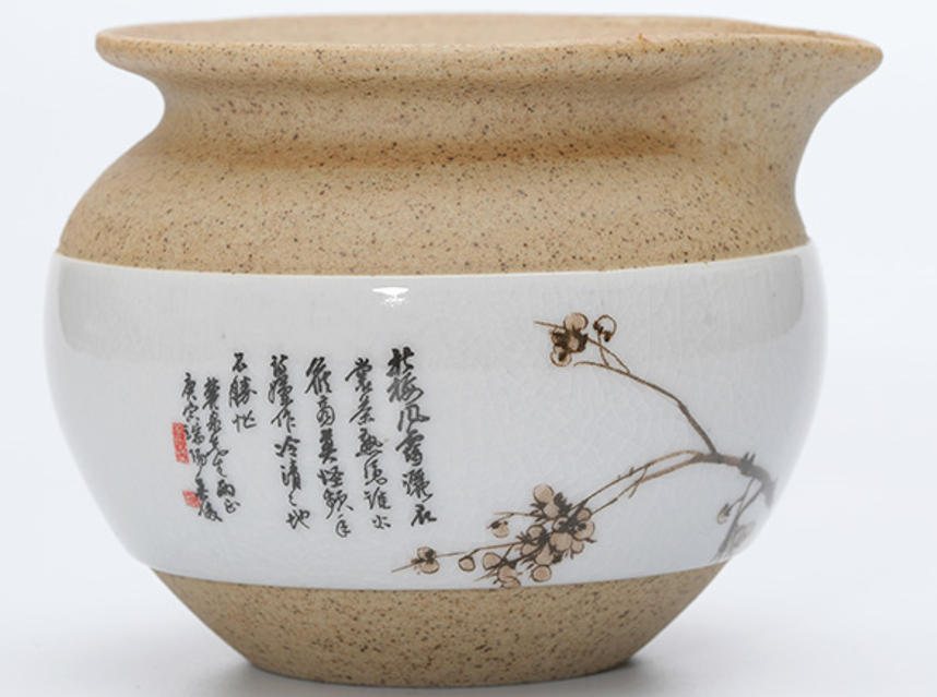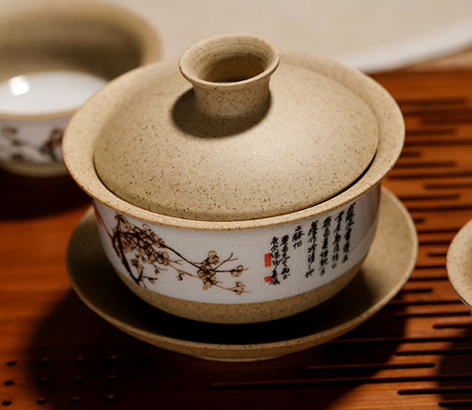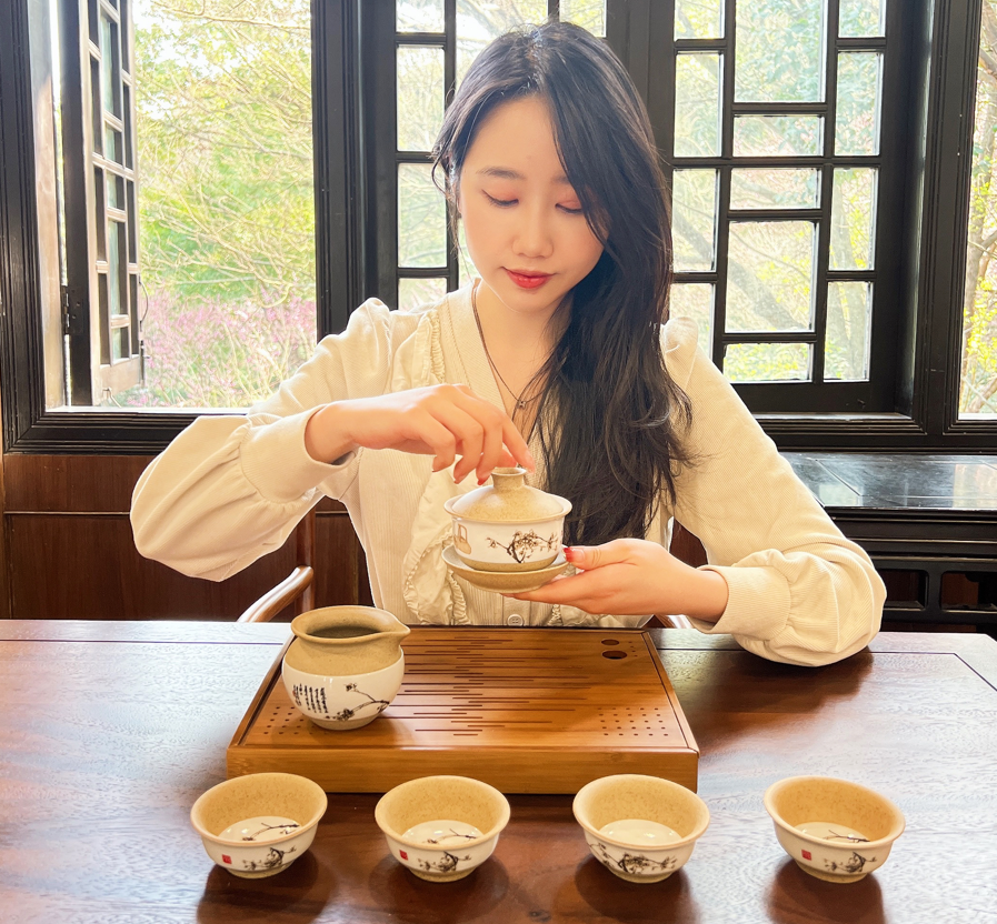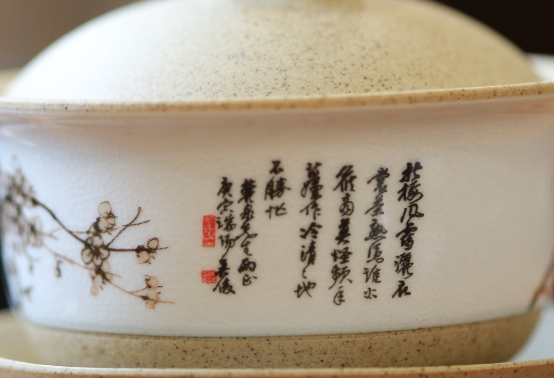 “玉映砂”工藝,選取上等紫砂泥料,再揉和裂紋釉工藝,既保留了紫砂泥料透氣養茶的特性,又悅目清心。梅花的輕香,茶具的美“色”,皆入茶香。
