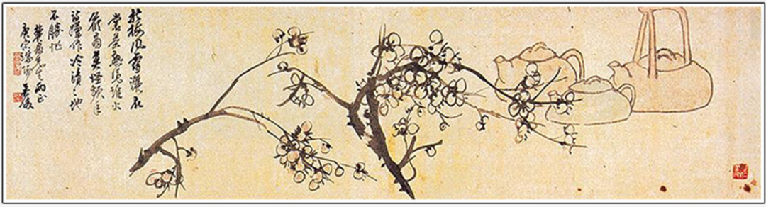 創作於1920年,粉白兩色,焦墨出之,梅花風骨,金石氣息畢露,凝重俊逸俱全。如眉毛般舒展開來的梅枝兩根,梅枝後畫有紫砂壺三把,其中一把是東坡提樑壺。
