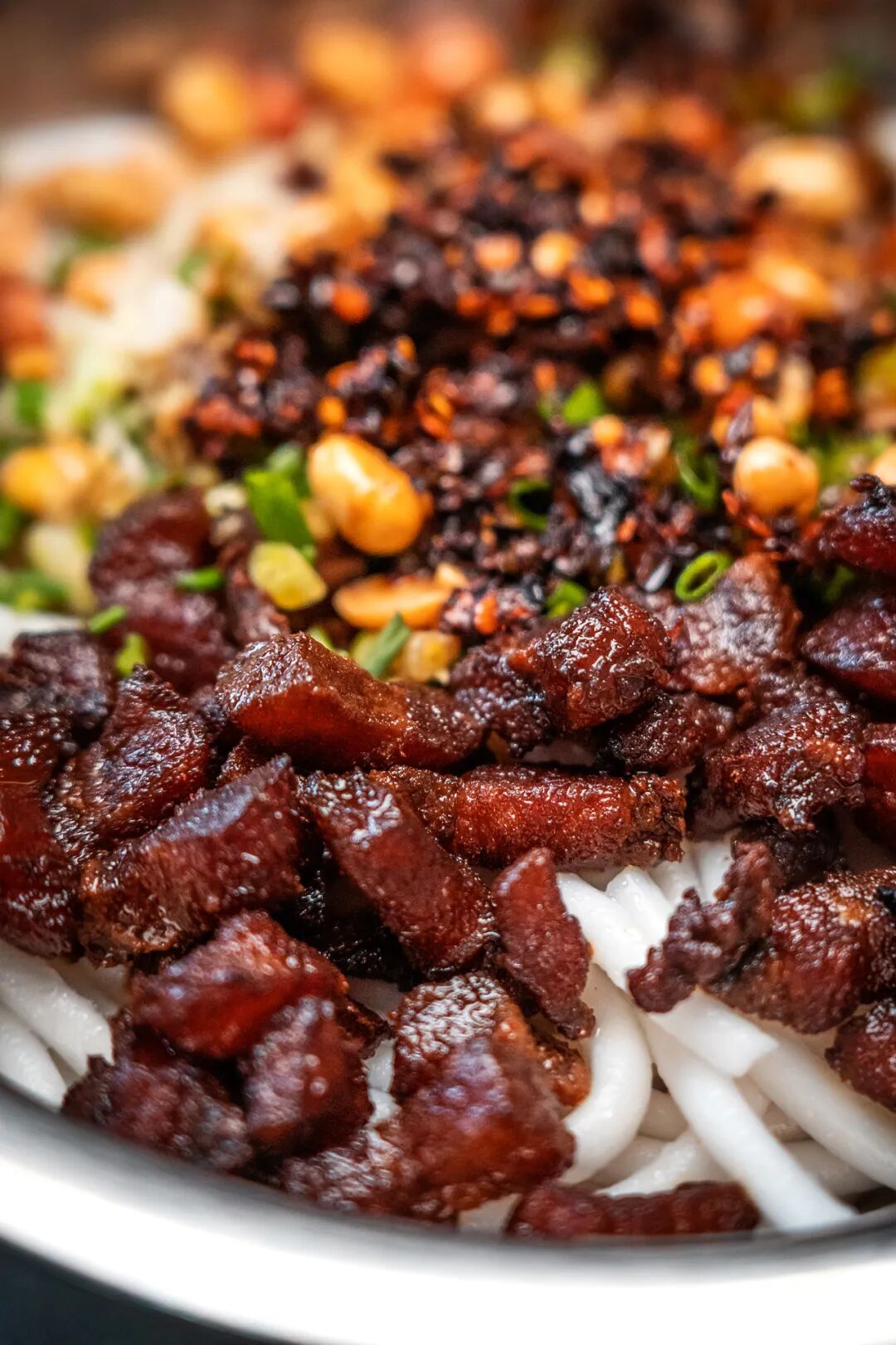 脆哨,無論加在哪種粉裡都很好吃,但為了不讓湯汁破壞香脆的口感,還是“幹拌”最為合宜。貴陽人最愛的老素粉,輕易不加肉,要加肉,必然把脆哨作為首選。這種拌粉的主料是酸粉,長得格外白胖短粗,沒有明顯的酸味,卻有發酵過的米香。掛上紅油,撒入香菜、黃豆、酸蘿蔔,還有靈魂脆哨,一嗦入口,多種配料在彈潤的米粉之間輪番出場,每一口都有驚喜。