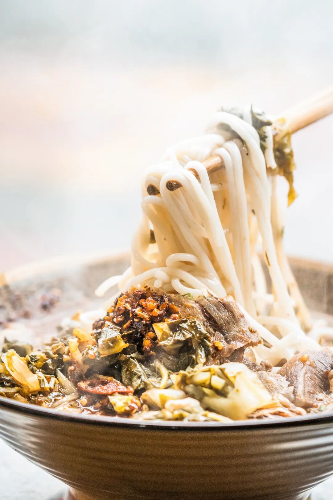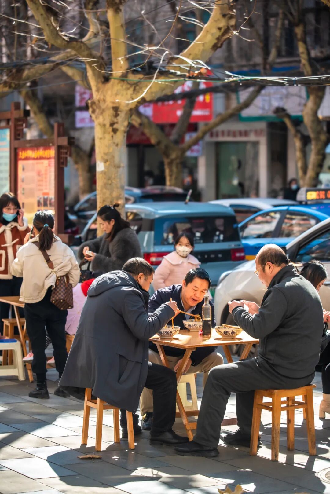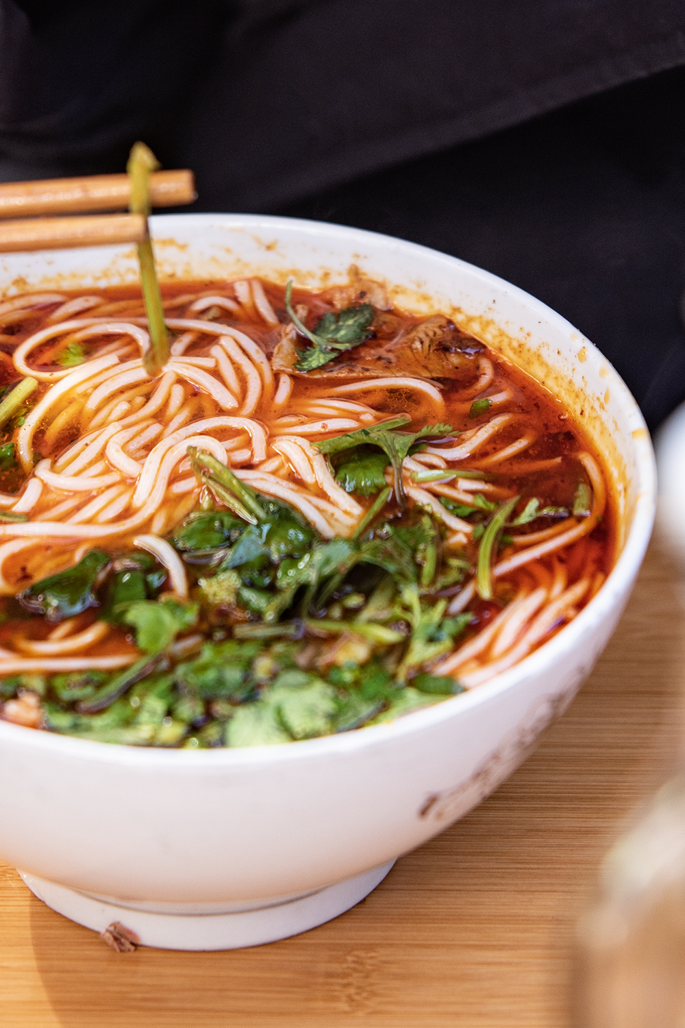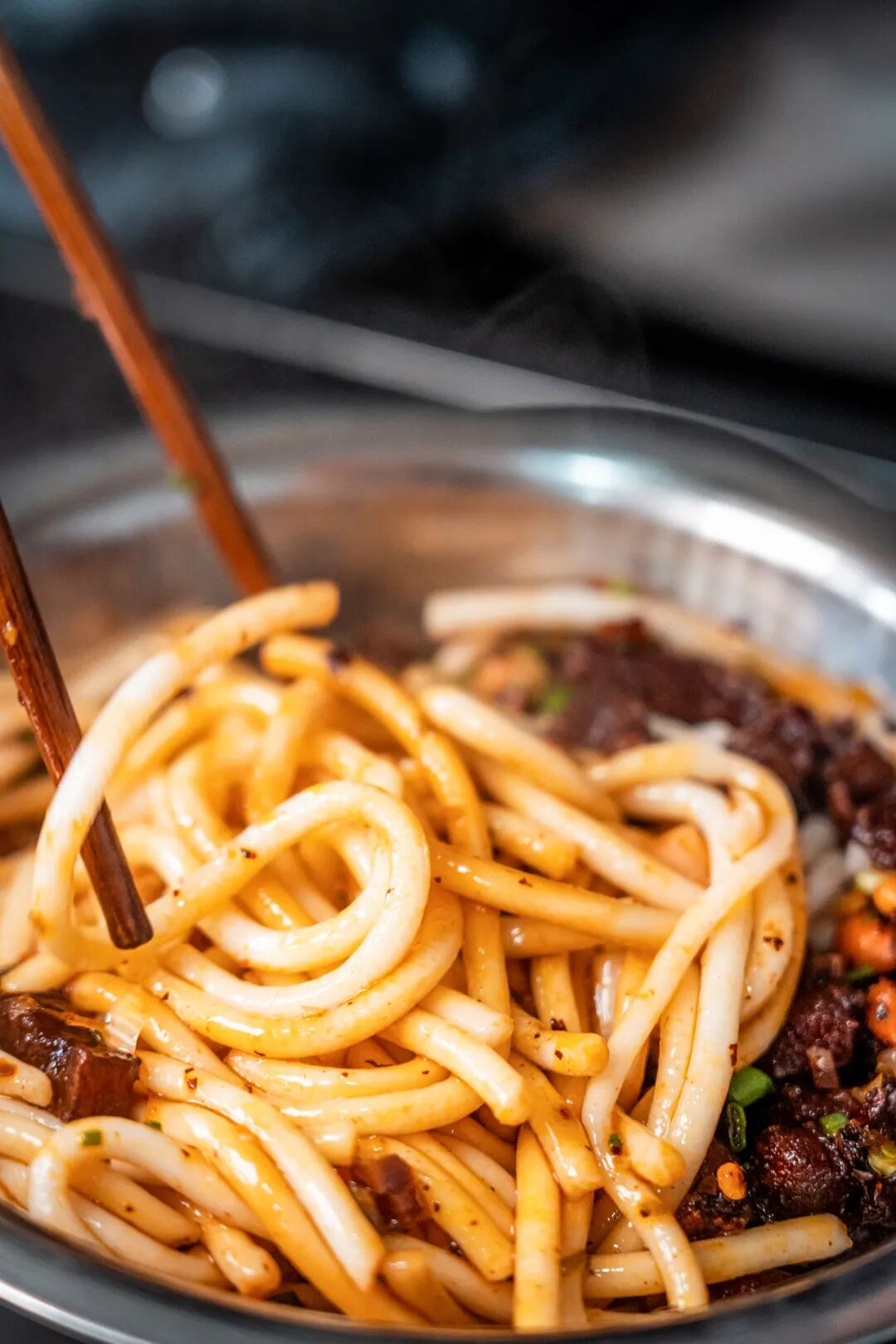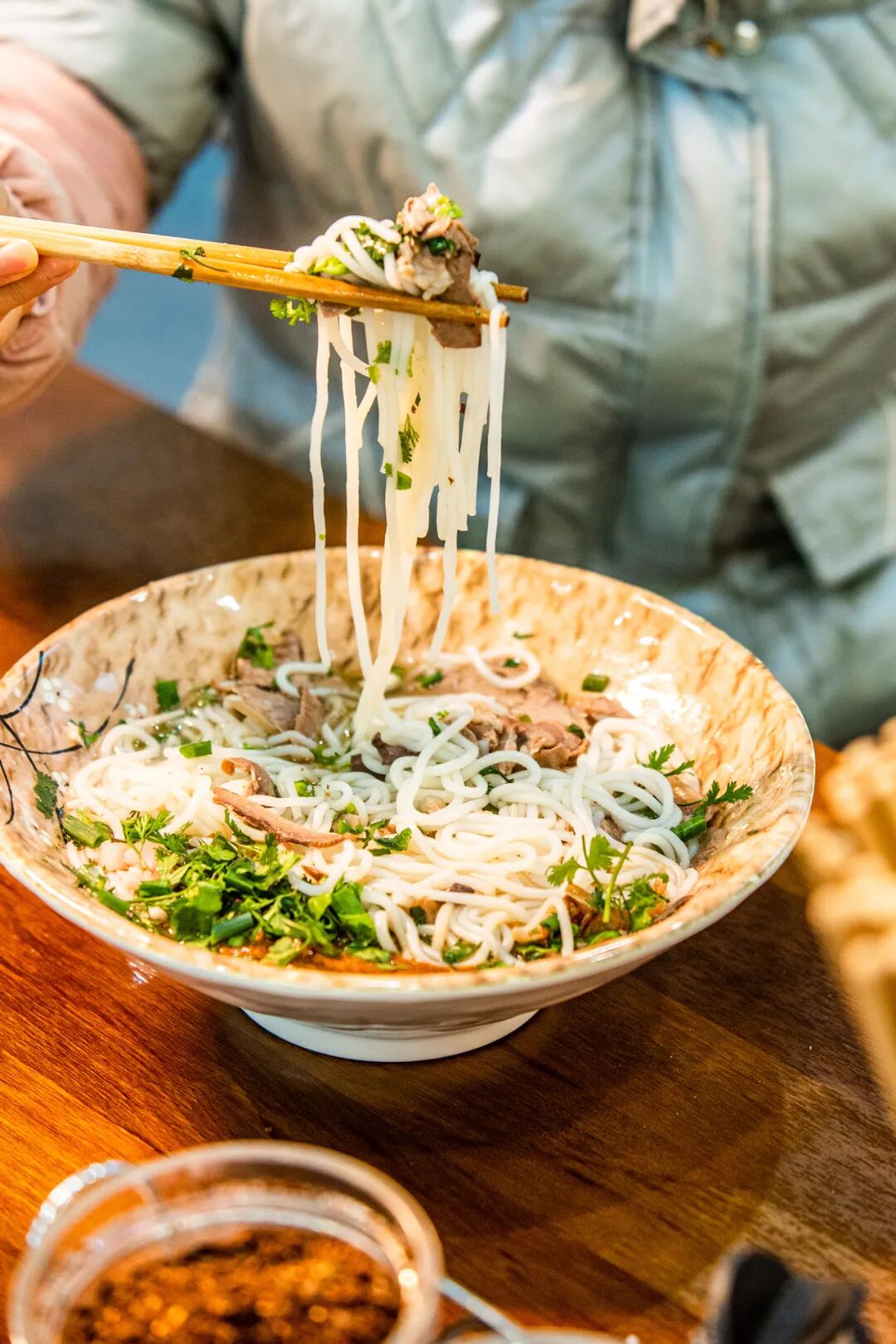 就先從一碗羊肉粉吃起吧。白嫩彈滑的粉,清清爽爽地窩在熱氣騰騰的湯裡,羊的鮮味已經和瘋了一樣往鼻子裡鑽。一勺油辣椒澆進去,味蕾就被瞬間激活。米粉裹住了湯汁,吸溜吸溜地往嘴裡送,緊實的羊肉、脆韌的羊皮、清爽的泡菜在齒間次第爆開。不等你反應過來,一碗粉已經嗦得乾乾淨淨,連湯都忍不住喝光——
