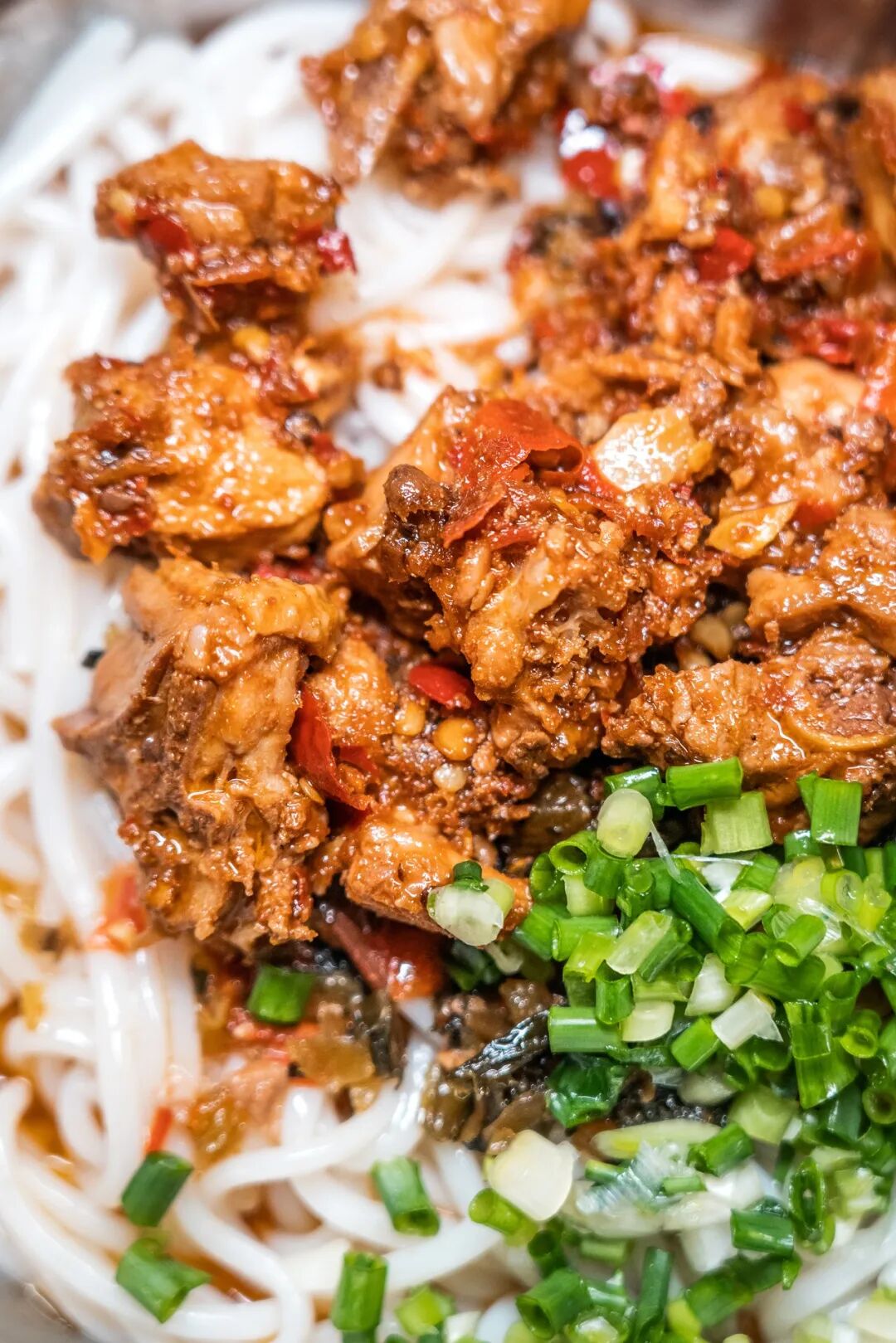 辣子雞,用來拌粉同樣絕佳。貴州的辣子雞與川、湘不同,不是用幹辣椒炸制雞丁,而是用口感獨特的“餈粑辣椒”與雞肉同炒。所謂“餈粑辣椒”,就是把辣椒與仔姜、蒜瓣一同搗碎至黏黏糯糯,炒雞丁時能與雞肉充分交融,辣而不猛,回味也就格外長了。家常做上一頓,拌粉能吃三五天。