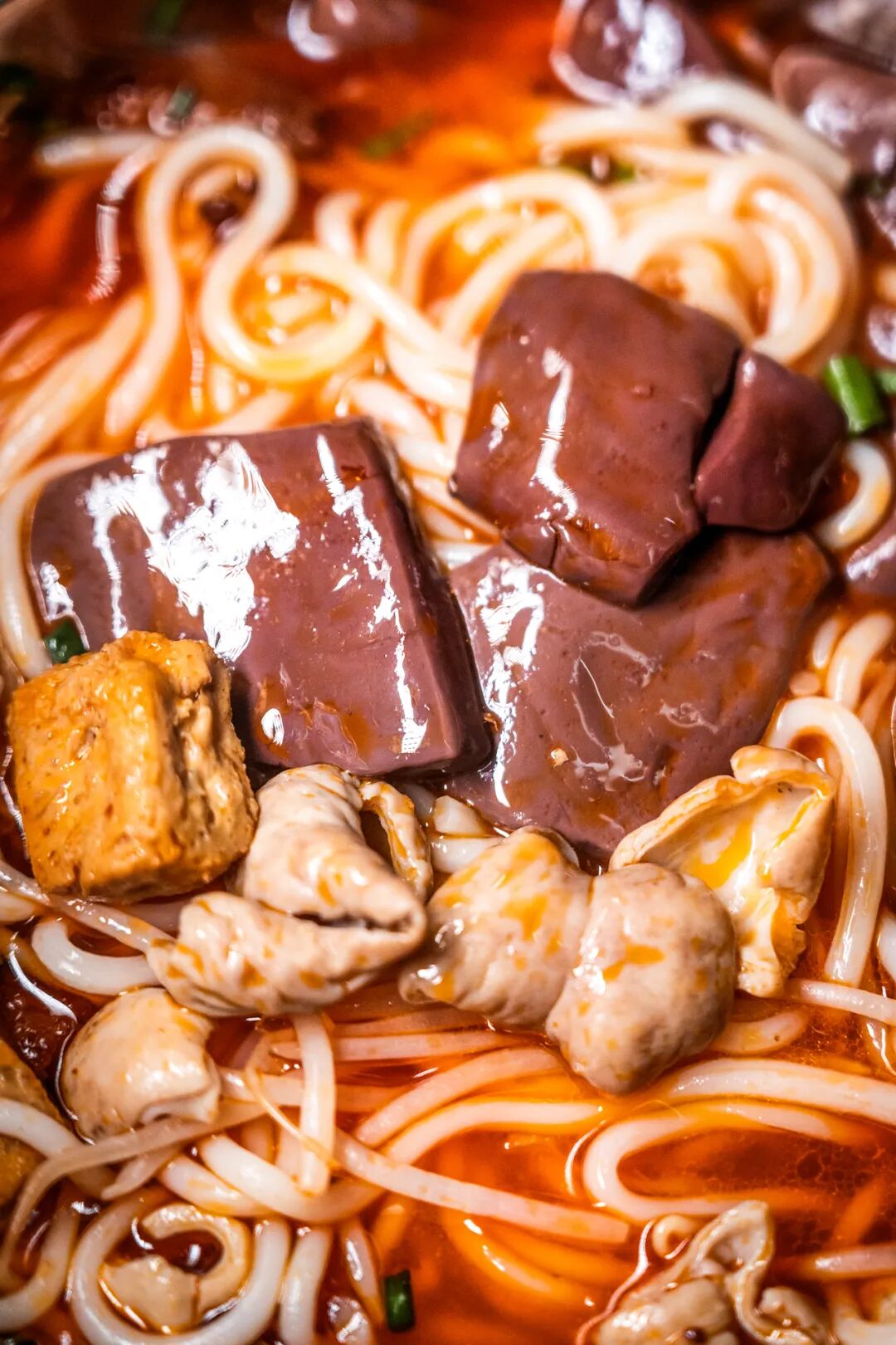 豬腸與豬血構成的“腸旺”,也是米粉的黃金搭檔。如今人們常吃以雞蛋麵製成的“腸旺面”,但民國時期出版的《黔味說略》中卻盛讚“腸旺粉”,稱“黔人嗜之者尤眾”。粉筋道,血嫩爽,腸肥腴,油辣椒裡又添了奇香的豬油,確實讓人回味無窮。