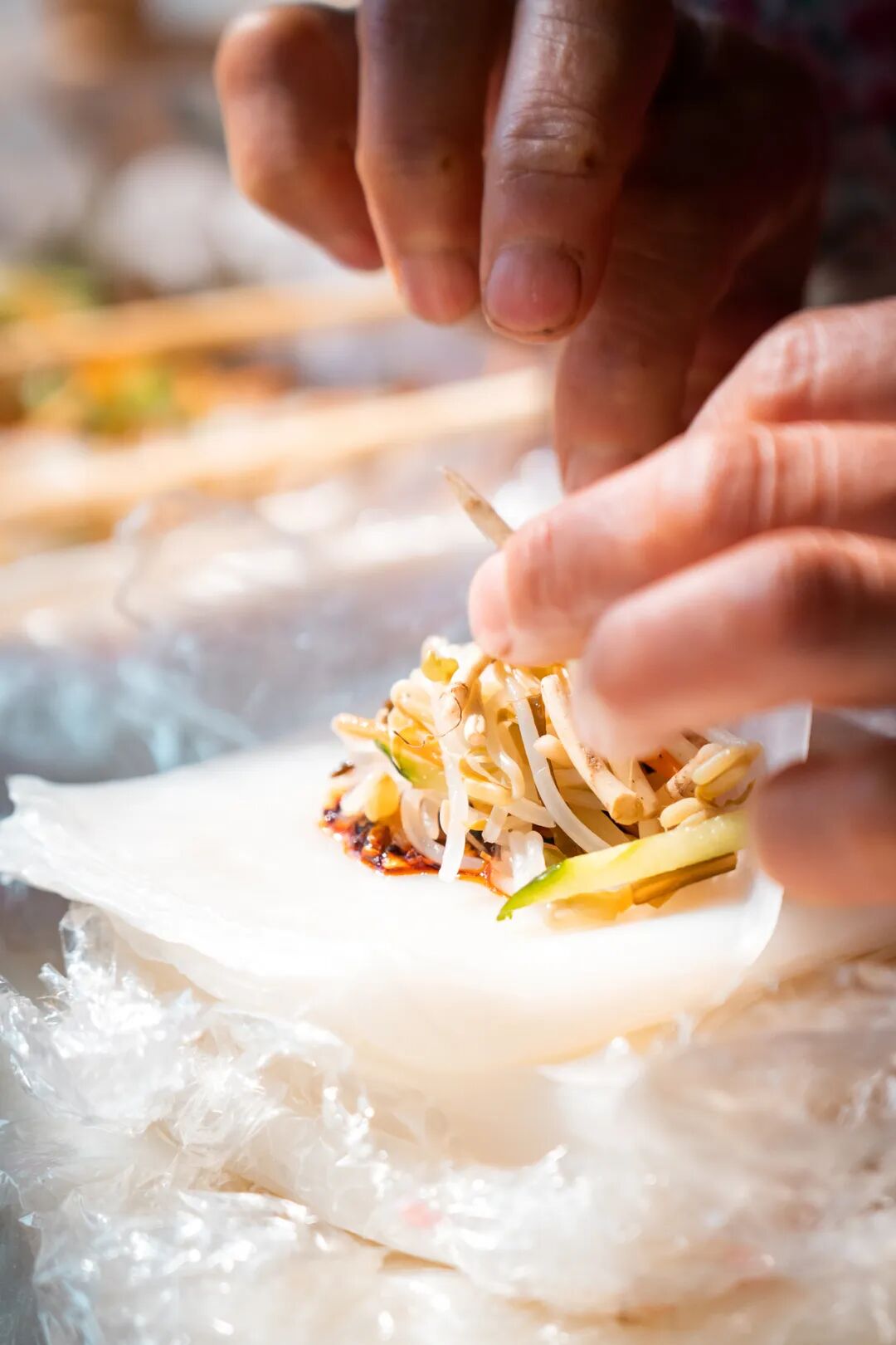 當然,腸粉有餡兒,最好還是用卷粉來類比。安順的小裹卷,方片狀的米皮裹上豆芽、酸蘿蔔、酥黃豆、折耳根,澆一勺黴豆腐水,一口一個,夏天吃起來最為清爽。榕江的卷粉卻要用扇形的米皮捲上肉沫、萵筍、香菇,成為一道熱騰騰的能量主食。