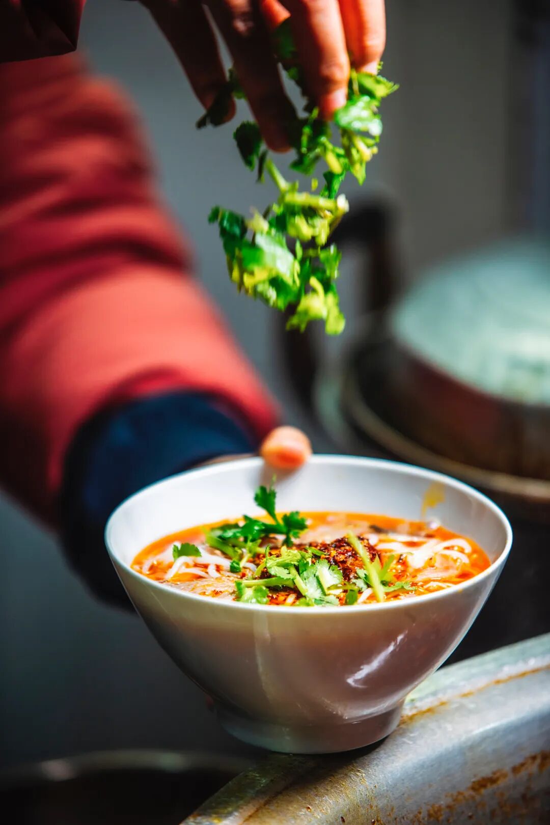 黔地有千萬種米粉,自然不是每一種都辣。或者說,正是因為這裡人人懂辣,辣的尺度才格外寬容靈活。粉面館裡,常備著油辣椒與煳辣椒,每家店鋪還各有制辣椒的秘方。食客自由地探索、搭配,彷彿踏進了一個辣味的迷宮,每向前一步都是新奇的體驗。更不必提在辣味的統領下,還有木姜子、折耳根、芫荽……種種叫人又愛又怕的香草,在那一勺米粉的湯汁或拌料中奇異交融。豐富多變,才是獨一無二的貴州味道。