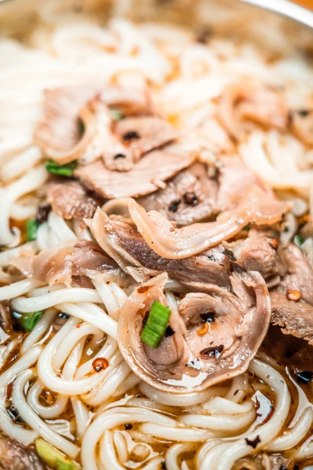 牛肉粉,也是貴州米粉中很出圈的存在。安順的牛肉粉,“紅燒牛肉”是美味的靈魂。上好的黃牛肉燉得又酥又爛,紅油辣子澆上去,伴著生薑與大料的香味暖透人的心窩子。貴陽的花溪牛肉粉素淨許多,清湯滷牛肉與黃燜並重,湯底卻加了牛油,粘稠,乳黃,不必重辣,吃的就是沉甸甸的油脂香。
