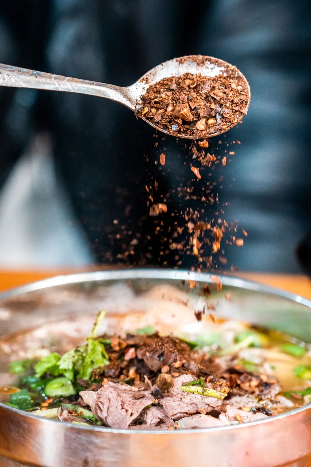 然後才輪到辣椒出場。桌上一排罈罈罐罐,老饕早就習慣了自己動手。煳辣椒撒出煙火味,油辣椒則激發出獨屬於脂肪的肥美,花椒麵、醬油乃至鹽,都可以由食客自己決定用量。這碗原汁原味的羊肉粉好似萬花筒,每個食客都能享用獨一無二的風光。