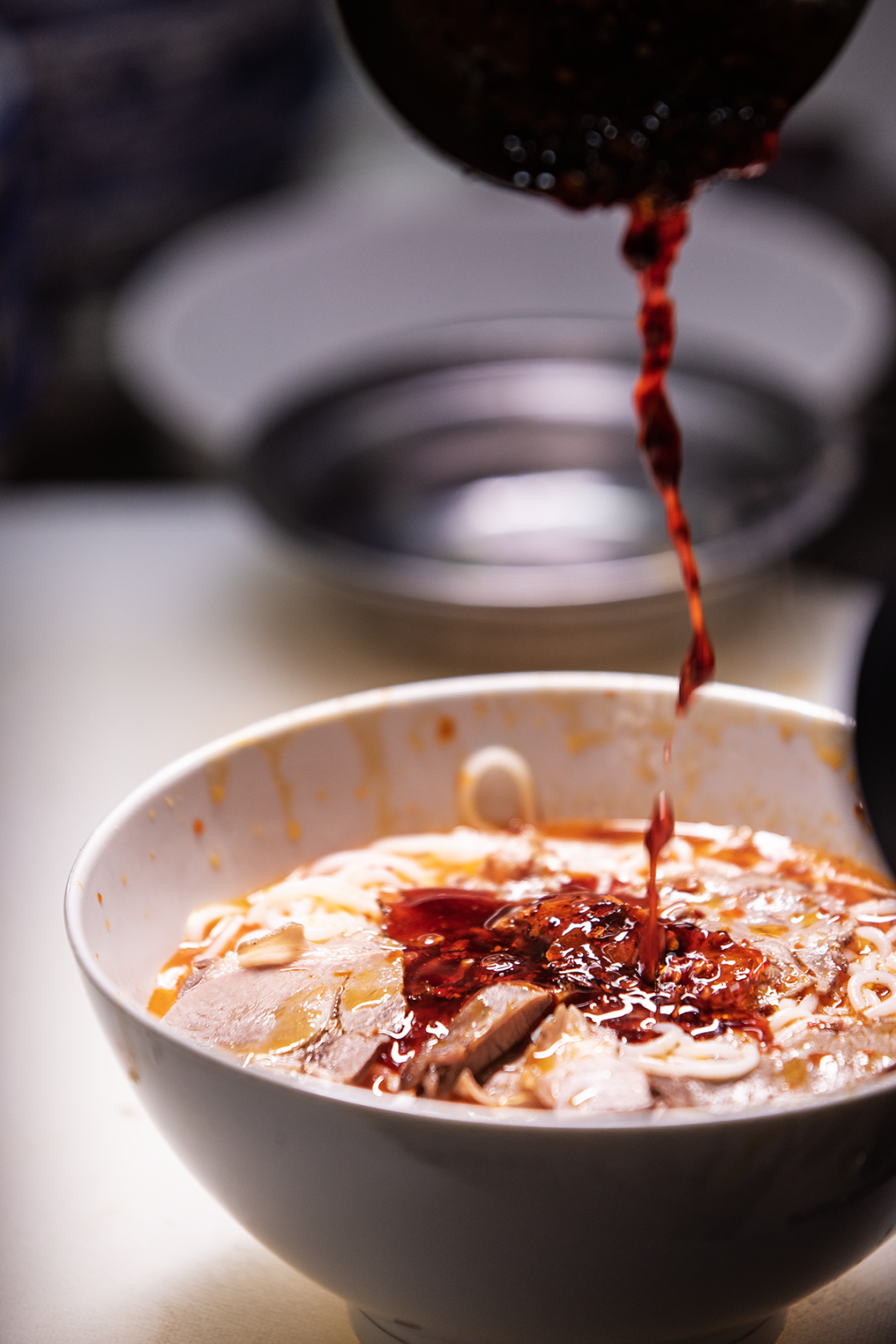 辣椒用熱油激發出香味,炸到表面微焦,趁著高溫臼碎,香辣還在飛濺,就泡進滋潤的油裡,把誘人的滋味盡數封存,就成了油辣椒。拌粉最好,澆在羊肉粉上更絕,紅潤潤地滲進肉的纖維裡,鮮美瞬間就提升了幾個檔次。