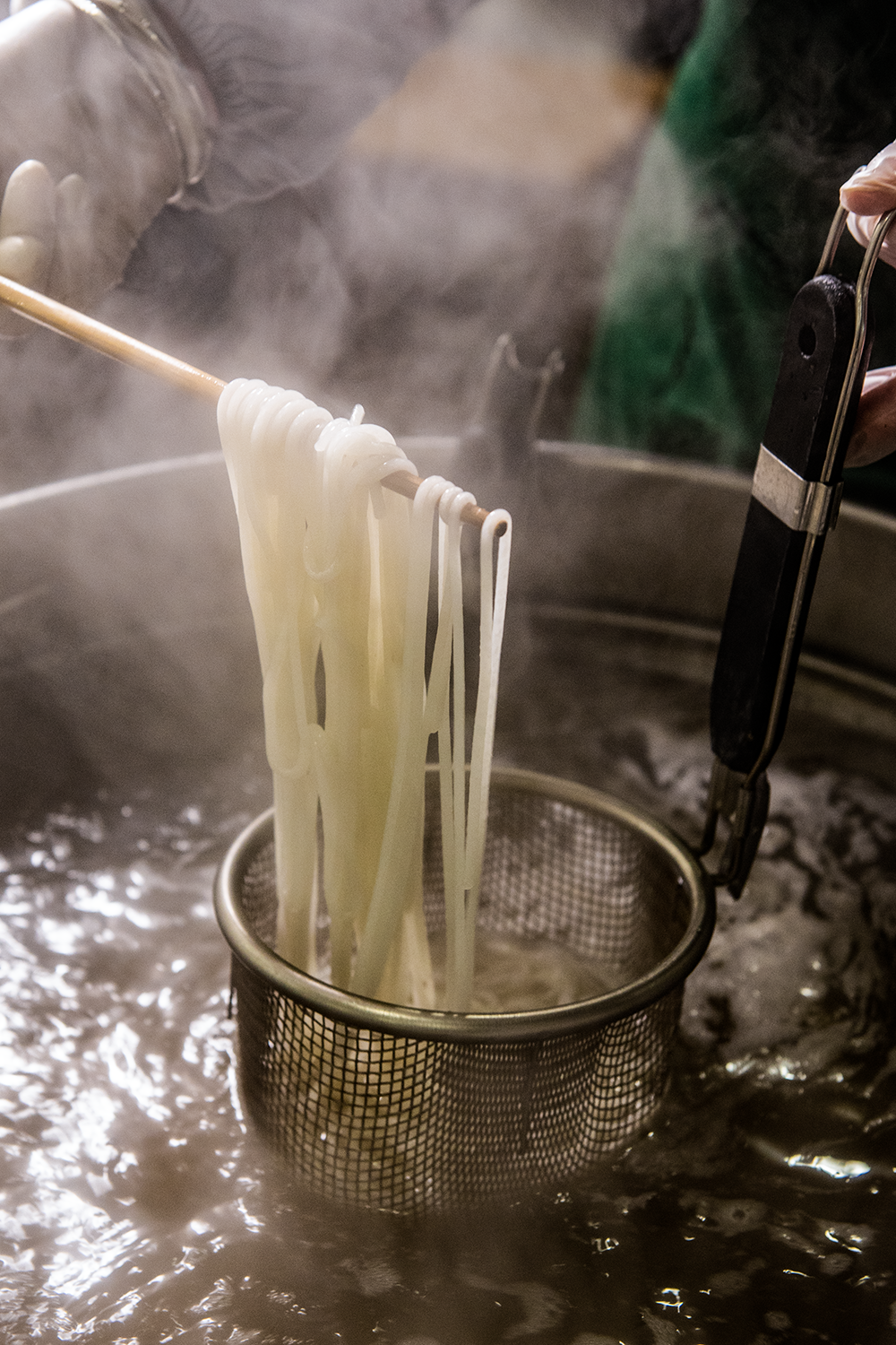 蒸汽氤氳,瑩白的米粉綻放出米香。攝影/吳學文