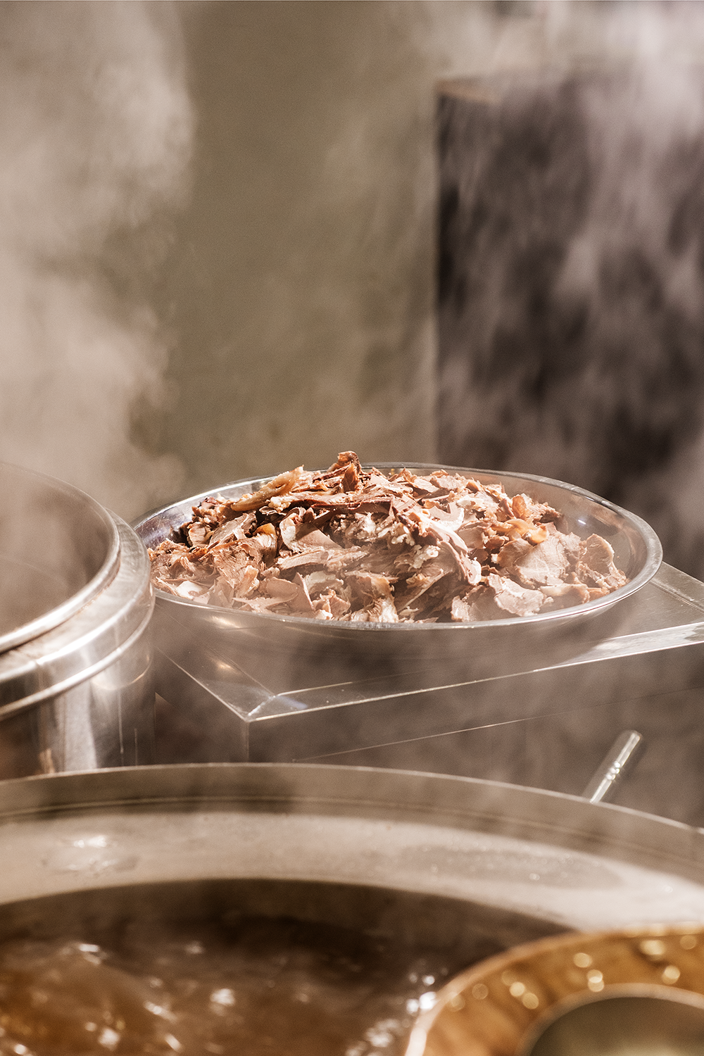 烹羊湯,每家都有自己秘製的料包,以甘松、草果、砂仁、白芷、茴香、陳皮、丁香等十餘味香料慢熬入味。制油辣椒,要選畢節的大方皺椒,肉厚微甜,香而不辣,還要以羊肉、芝麻炒制,油汪汪的,香得人從心底生出能量超標的罪惡感。