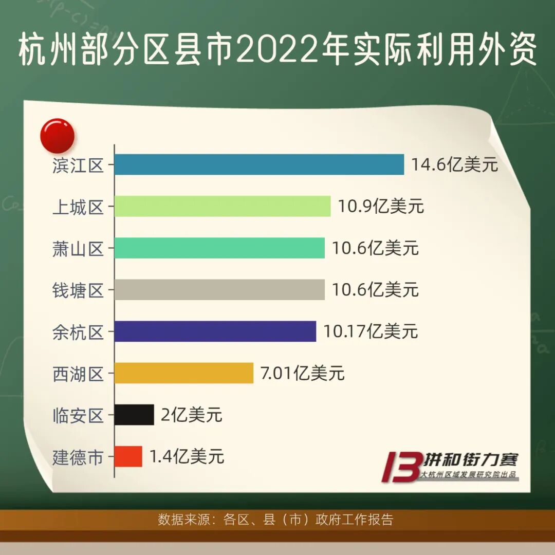 據杭州各區、縣(市)政府工作報告中的相關數據,杭州部分區縣市2022年實際利用外資情況各有不同:除了濱江區以14.6億美元獨佔鰲頭外;上城區10.9億美元、蕭山區10.6億美元、錢塘區10.6億美元和餘杭區10.17億美元緊隨其後;西湖區7.01億美元稍稍落後;臨安區2億美元和建德市1.4億美元,兩者都有上升空間。