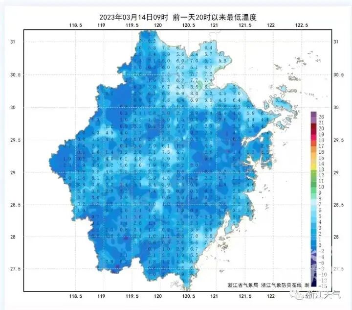 看看今早全省的最低氣溫,杭州東部、嘉興南部、紹興北部和金華中部等地6~8℃,其它地區大部2~6℃,還是有點冷的。