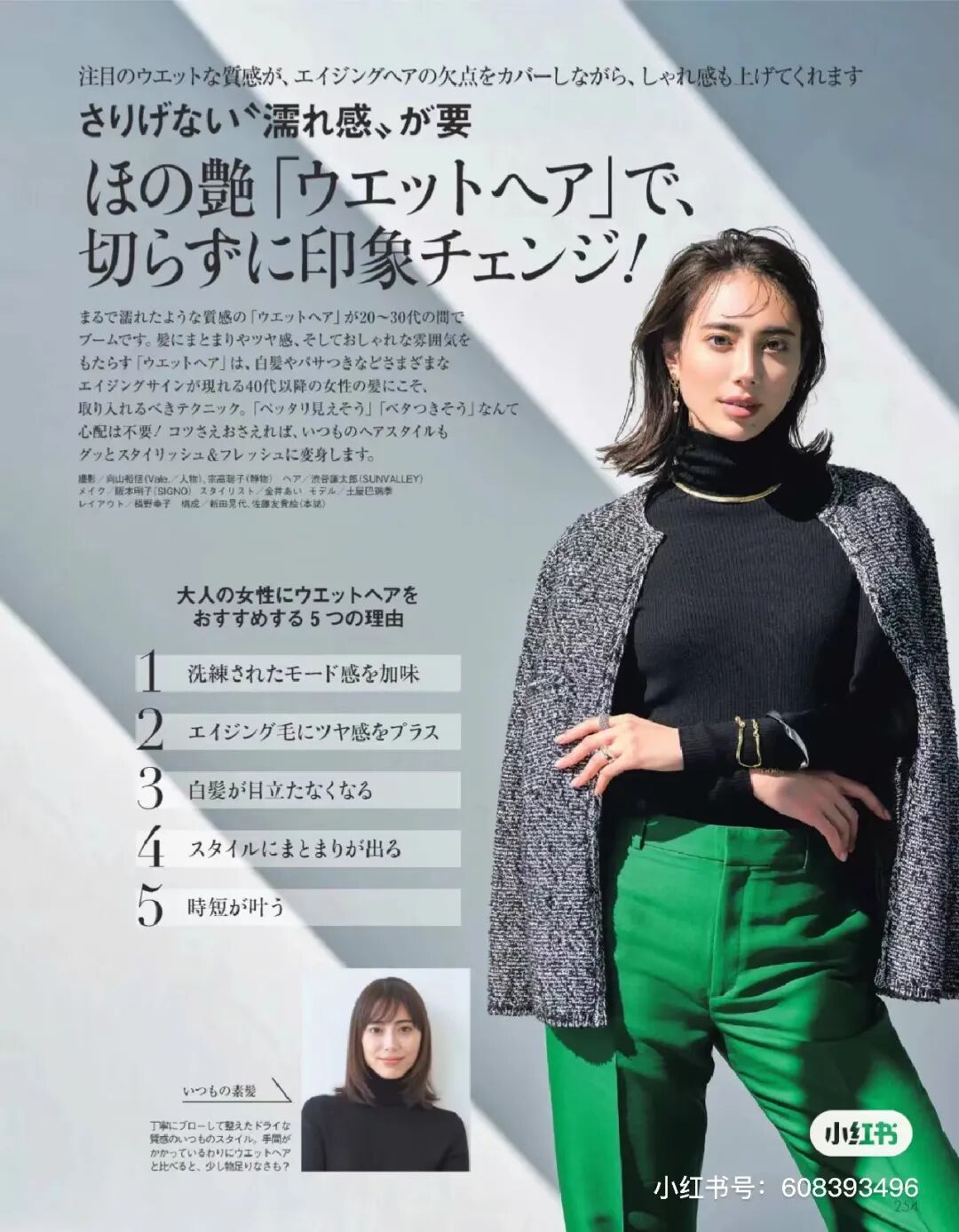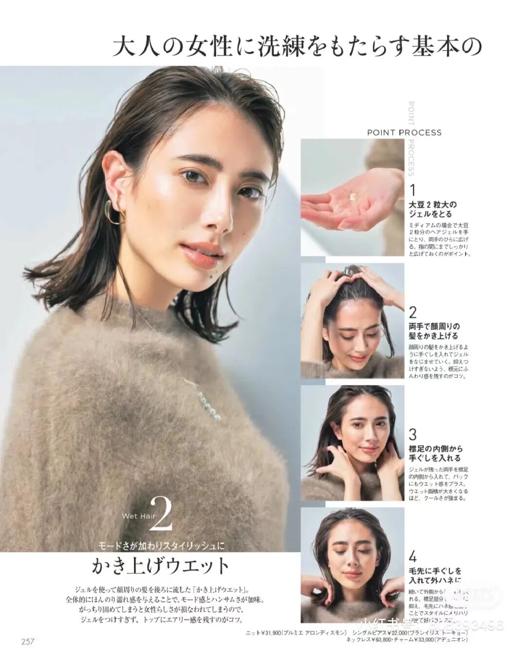 真正的溼發造型不是全部打溼,而是要用定型產品強調出髮絲的立體感,增強造型感,從而顯得靈動、輕巧。日雜上展示的溼發教程,也很好地說明了這一點。