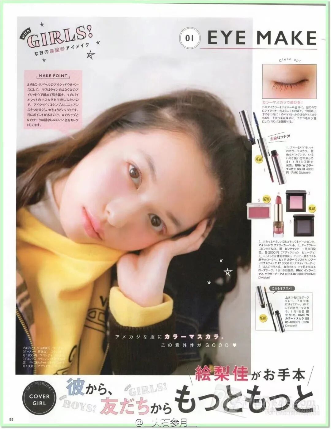 8年前的日雜妝容,就已經會在鼻樑、顴骨、內眼角、唇周處鋪滿高光,強調出飽滿瑩亮的皮膚質感。可以將模特的臉和手臂質感進行對比,面部光澤度明顯是更高的。