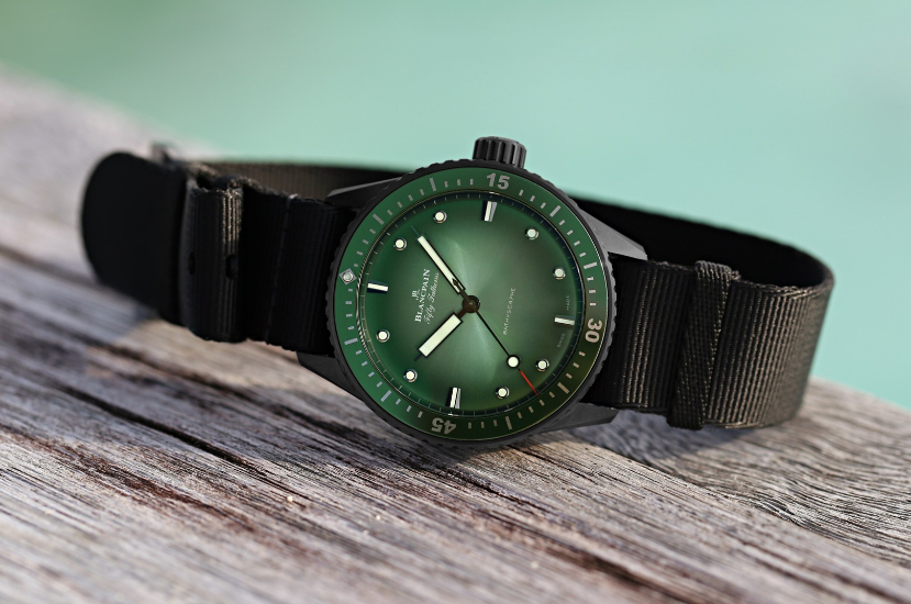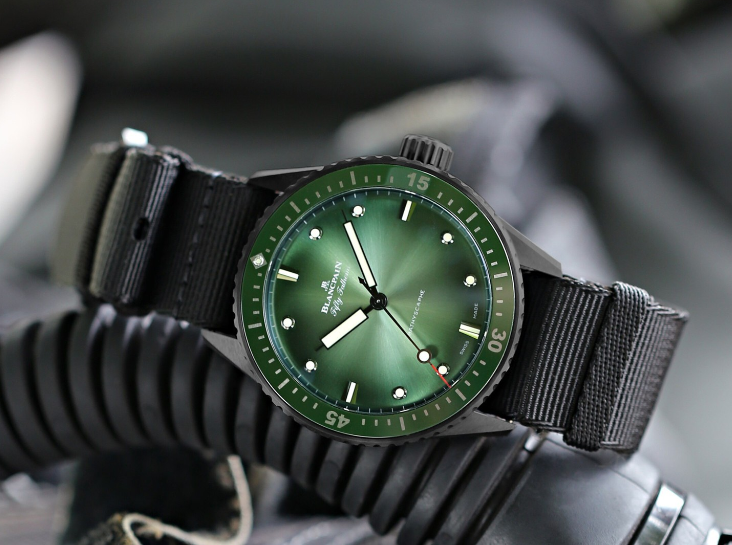 以軍用潛水錶出身的五十噚系列,材質和設計的選擇性很多,腕錶採用陶瓷材質打造錶殼,經工藝處理呈現緞面磨砂黑效果,表徑達43.6毫米,單向旋轉潛水計時錶圈以綠色陶瓷嵌飾,綠色飾以具有極光光芒感的線條飾紋,與表圈搭配相得益彰,時標指針均塗覆夜光塗料,使得在水下佩戴也可清晰讀時。腕錶採用背透設計,透過藍寶石玻璃表背機芯運行美態清晰可見,腕錶搭載一枚1318自動上鍊機芯,這是一款以1315機芯為基礎開發的經典機芯,尤以其精準度、高性能和精緻美感為特色。這款自動上鍊機芯由為運動腕錶特別研發生產,其擺輪配備硅質遊絲和3個發條盒,可提供長達5天的動力儲備,防水性能也達300米。
