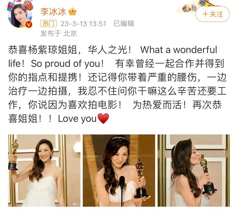 昨天李冰冰發微博慶祝楊紫瓊拿下奧斯卡影后,