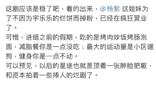 比如楊紫的粉絲,催她每頓飯要吃減脂餐,做運動、