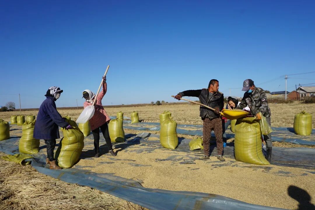 這個季節的五常大地,處處都彰顯著廣袤的豐收的喜悅。等到必須給它們收割下來的時候,也都暫時先堆在地裡。等到脫粒了,直接在寬闊的稻田裡,鋪上一層寬寬大大的苫布進行晾曬。晾曬完了放到袋子裡,然後要出售了,再給它去殼兒。