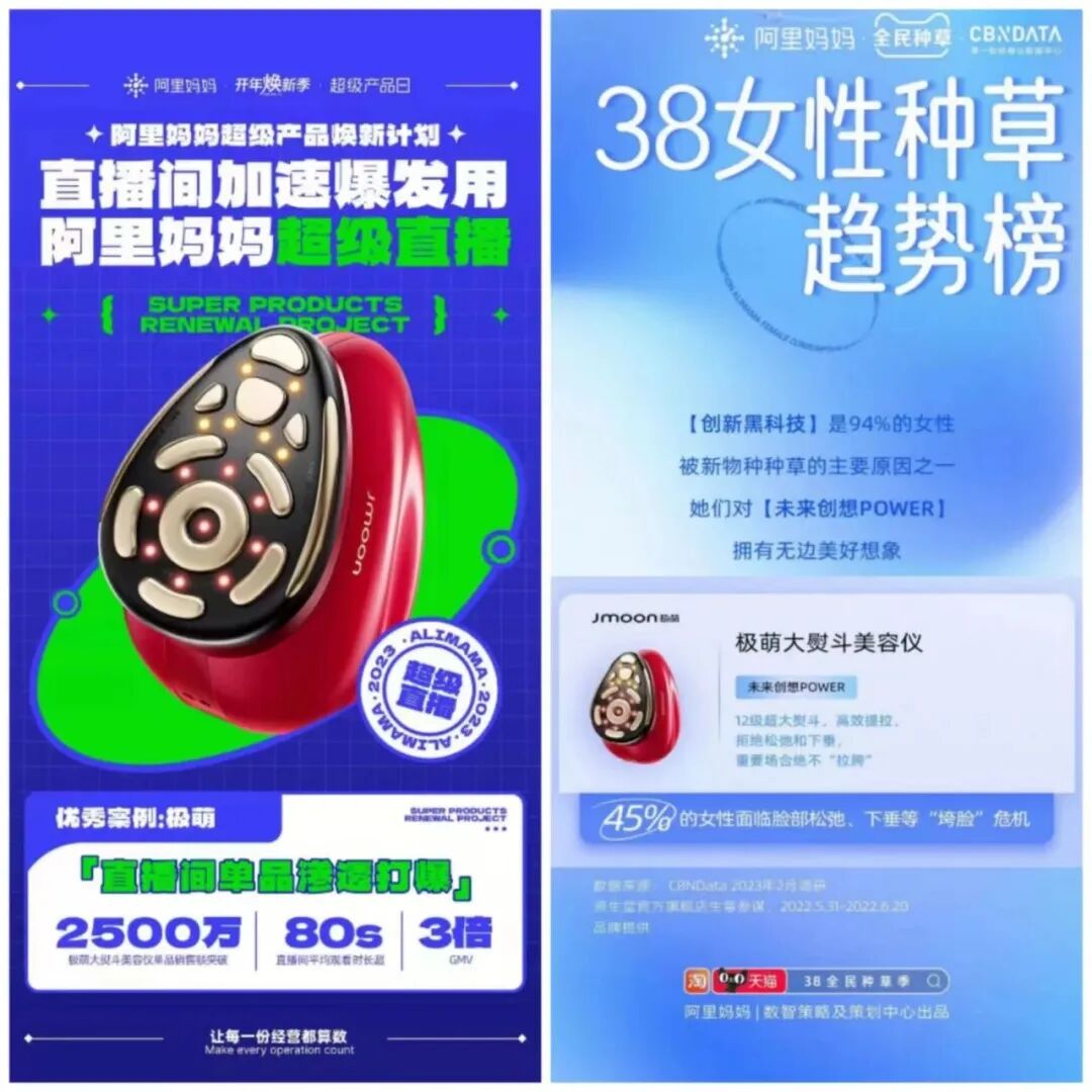 在天貓平臺,極萌Jmoon憑藉大熨斗美容儀這一個單品,通過直播引流,3個月的銷售額就高達2.4億元,店鋪GMV提高了300%,還登上了“2023阿里媽媽38女性種草趨勢榜”。