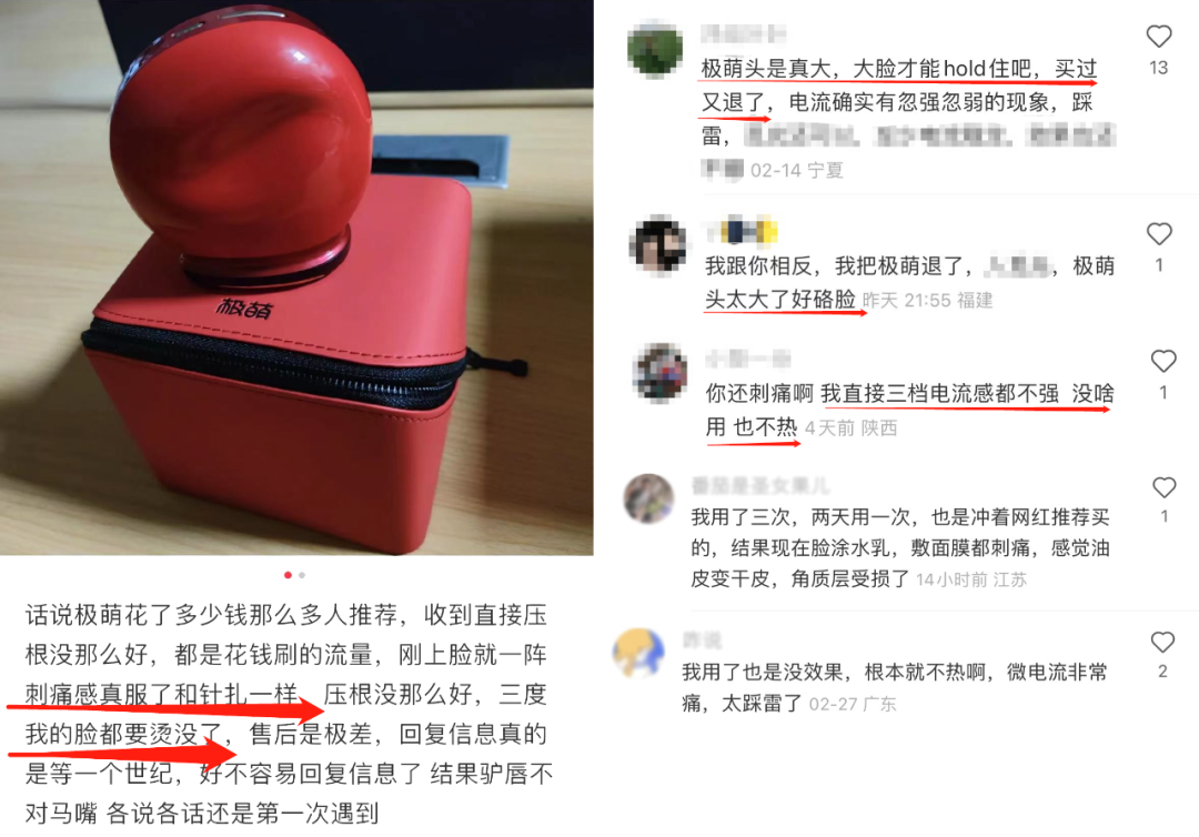 部分消費者更是反饋品控不到位,很多儀器存在質量問題。比如:電流不穩定,忽強忽弱;有的消費者“臉都要燙沒了”,有的消費者則“根本感受不到熱度”“用了個寂寞”;還有不少人表示用後刺痛,加重了肌膚敏感,屏障受損
