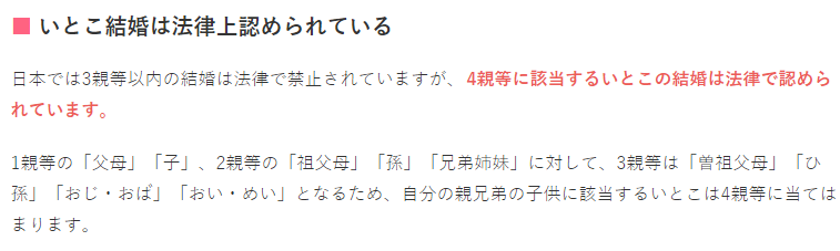 先別激動!日本法律規定的是:堂兄妹可以結婚!也就是說三代之內近親不能結婚,但是第四代第五代……日語為“いとこ婚”。